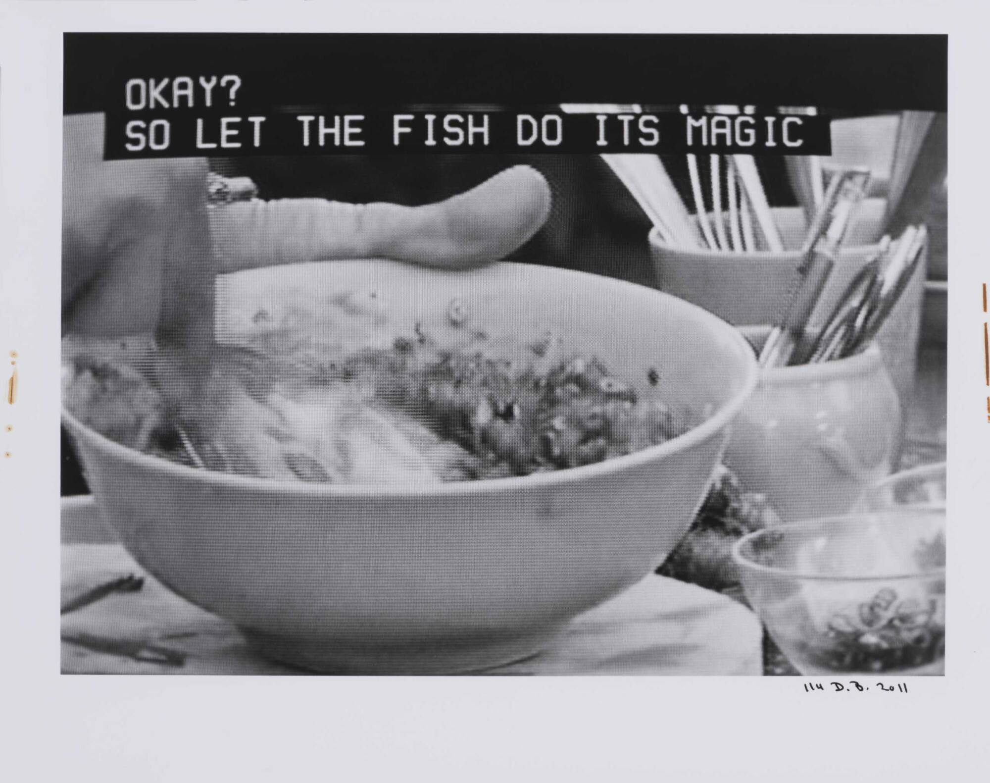 DescriptionPixelated image from a television screen showing a hand mixing food in a bowl along with subtitles "OKAY? SO LET THE FISH DO ITS MAGIC".Copyright© Donald Blumberg