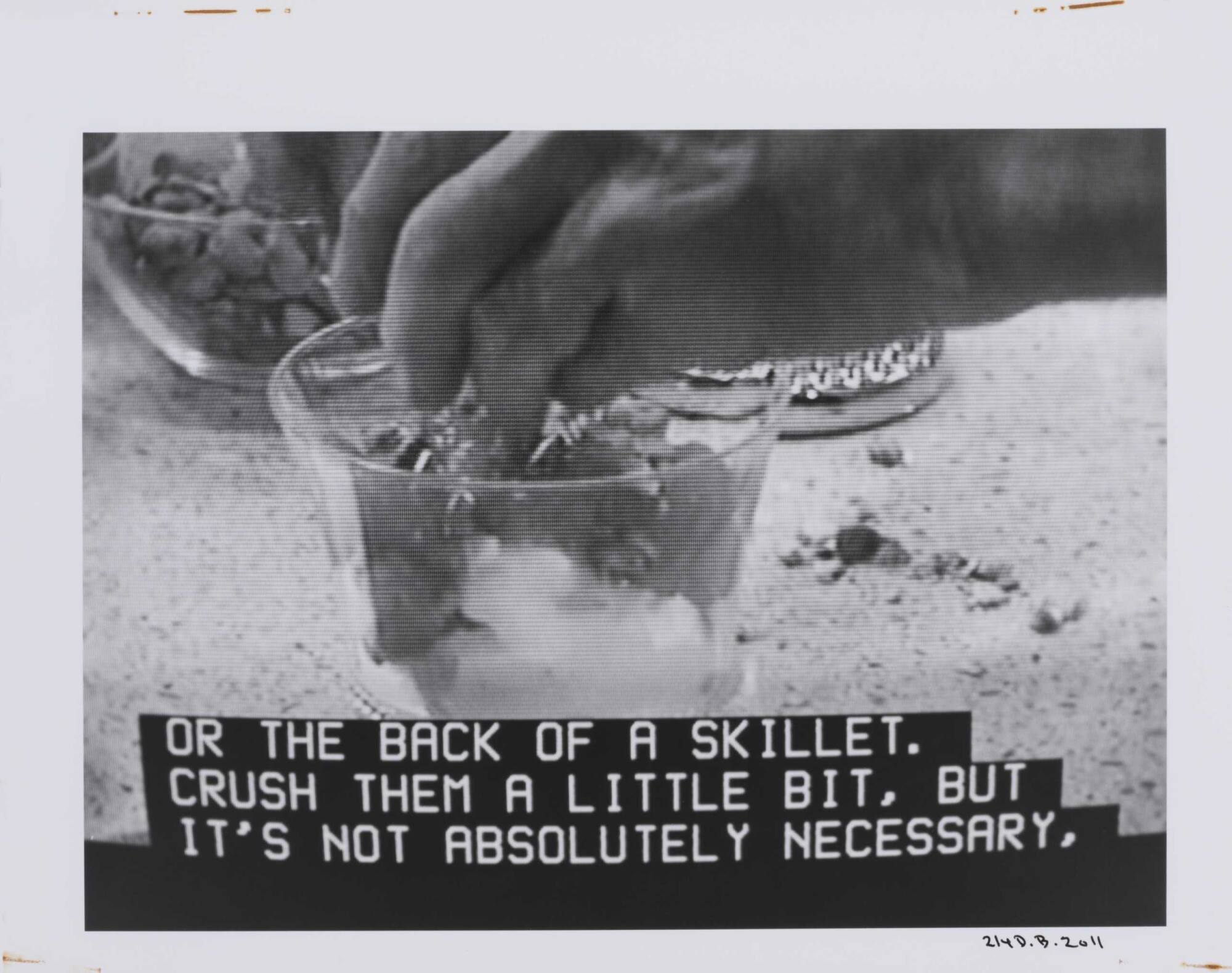 DescriptionPixelated image from a television screen showing a hand reaching over a small cup along with subtitles "OR THE BACK OF A SKILLET. CRUSH THEM A LITTLE BIT, BUT IT'S NOT ABSOLUTELY NECESSARY."Copyright© Donald Blumberg
