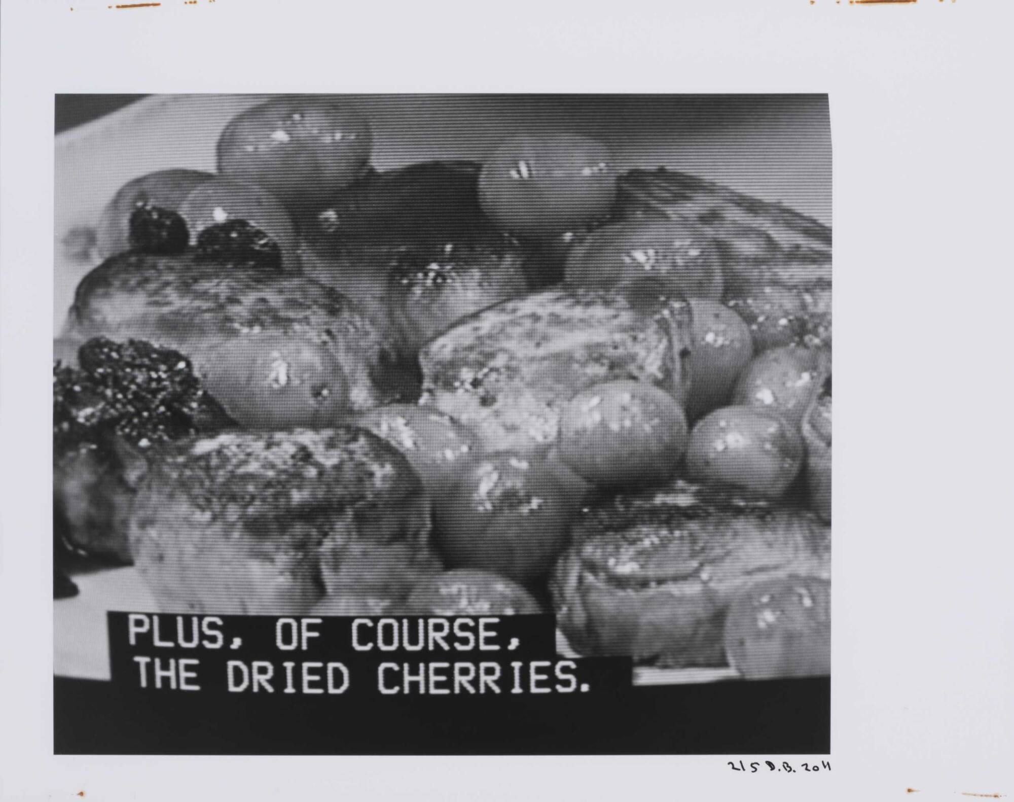 DescriptionPixelated image from a television screen showing a bowl filled with scallops, grapes, and cherries along with subtitles "PLUS, OF COURSE, THE DRIED CHERRIES."Copyright© Donald Blumberg
