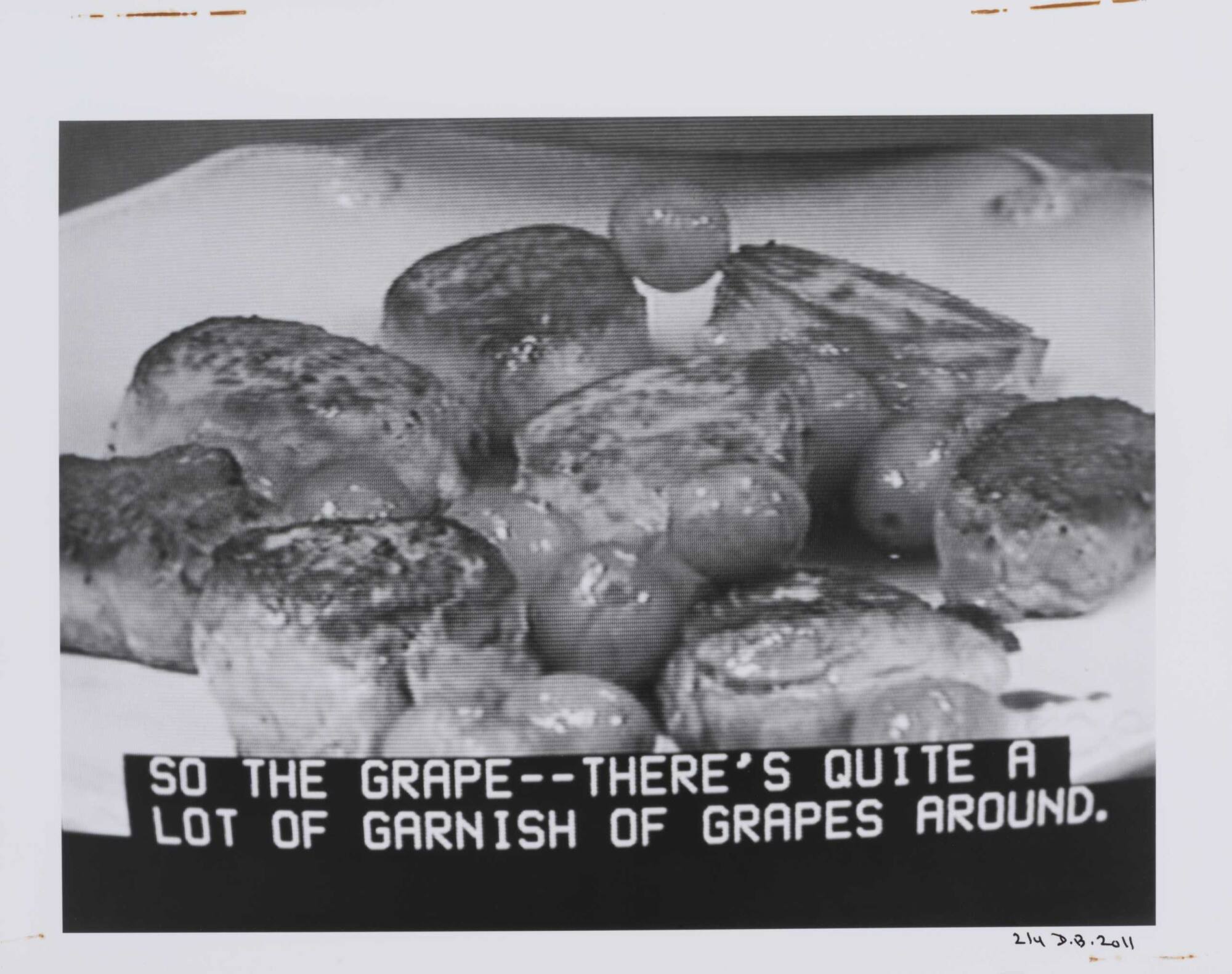 DescriptionPixelated image from a television screen showing a bowl filled with scallops and grapes along with subtitles "SO THE GRAPE--THERE'S QUITE A LOT OF GARNISH OF GRAPES AROUND."Copyright© Donald Blumberg