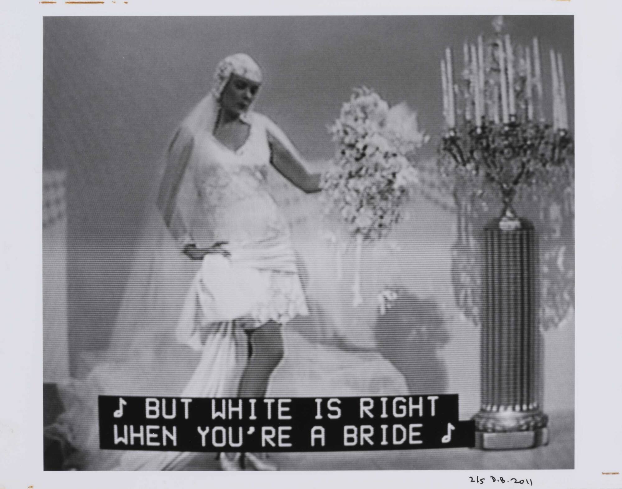 DescriptionPixelated image from a television screen of a woman in a wedding dress holding flowers, and subtitles "BUT WHITE IS RIGHT WHEN YOU'RE A BRIDE".Copyright© Donald Blumberg