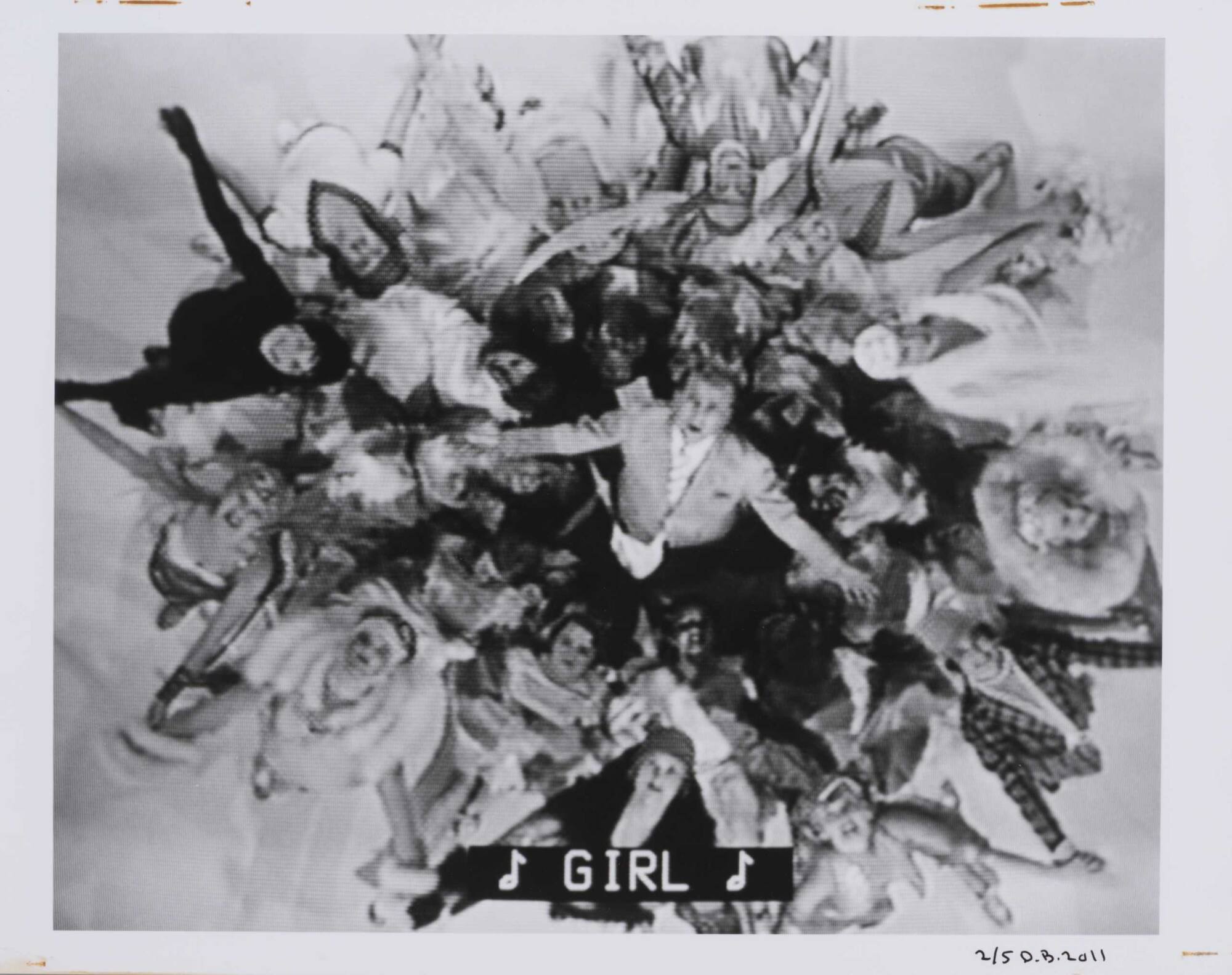 DescriptionPixelated image from a television screen of a man in a suit surrounded by women with arms outstretched along with subtitles "GIRL".Copyright© Donald Blumberg