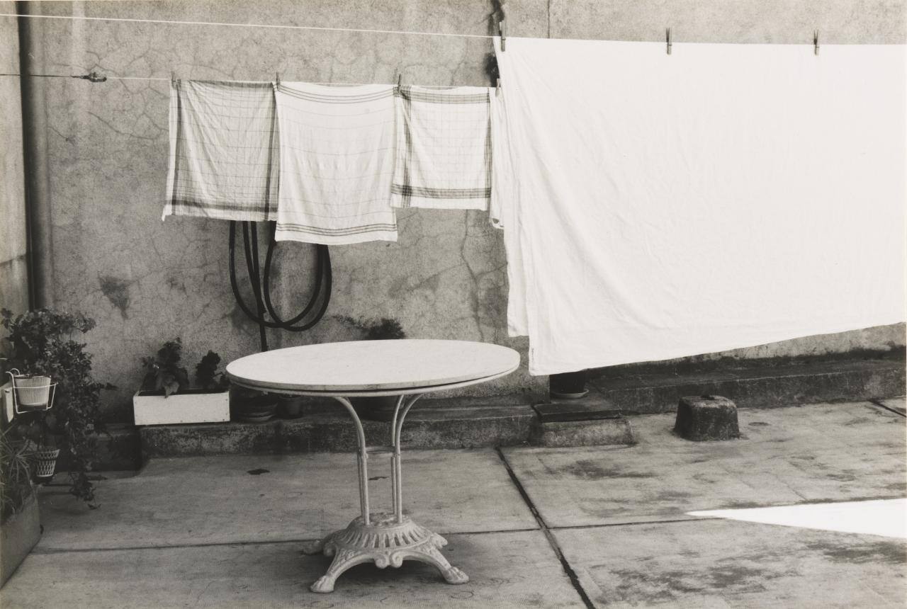 DescriptionImage of a round table on patio with laundry hanging out to dry.Copyright© Linda Connor