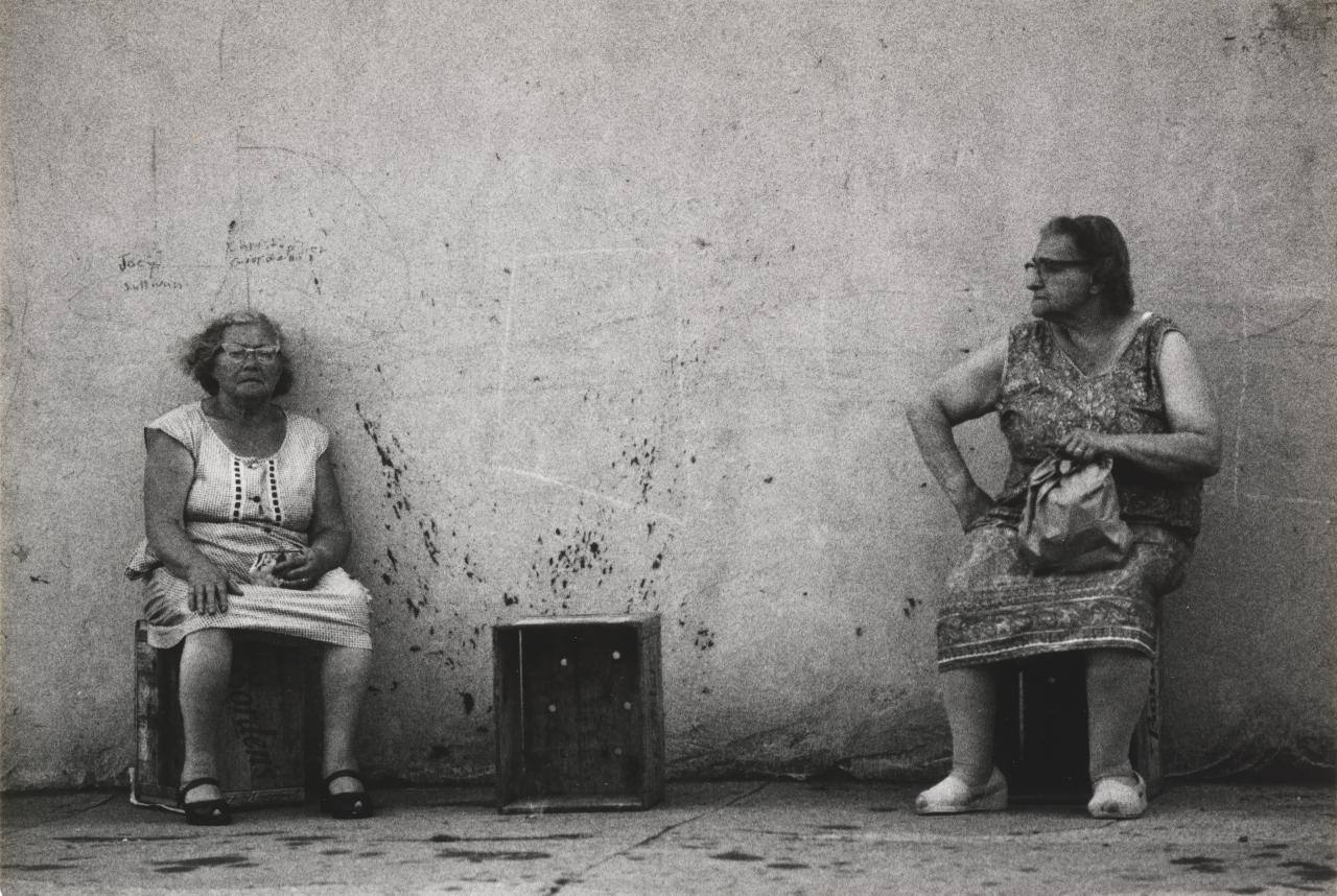 DescriptionImage of two older women in dresses seated on wooden crates in front of a cement wall.Copyright© Murray Riss