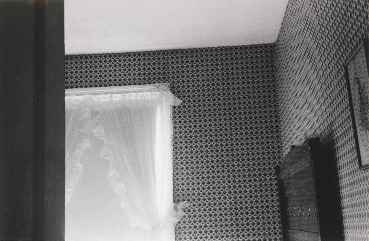 DescriptionInterior image of a bedroom corner with wallpaper and sheer curtains.Copyright© Eileen Rubinstein