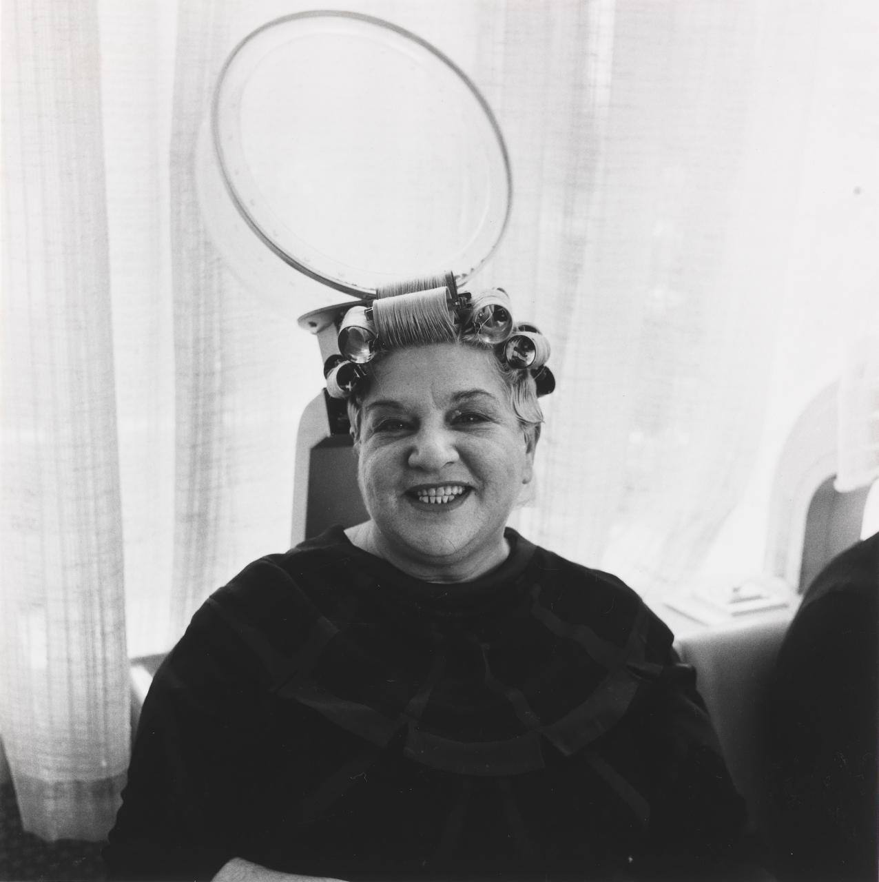 DescriptionImage of a smiling woman seated in a beauty shop with curlers in her hair.Copyright© Edward Grazda