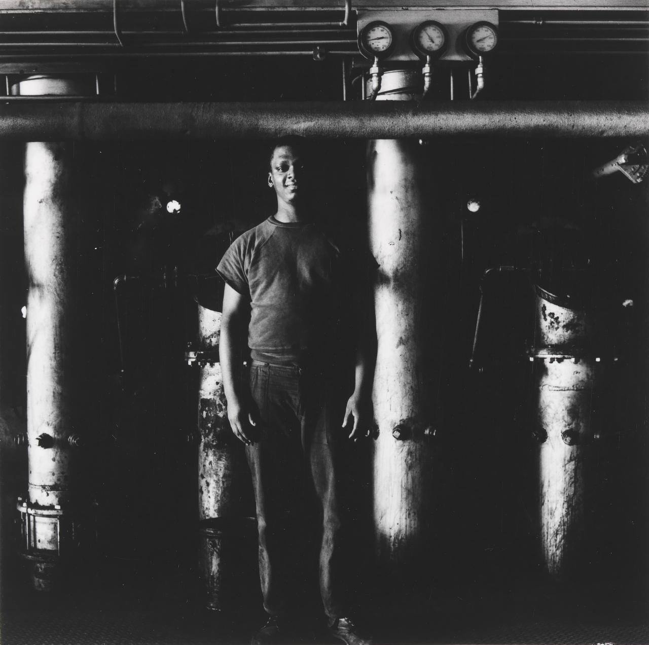 DescriptionImage of man standing in front of large pipes.Copyright© Julius Neelley