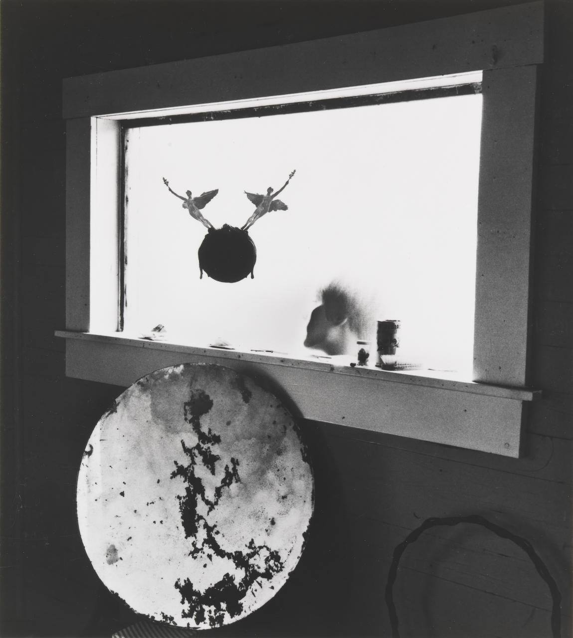 DescriptionInterior image with person pressing cheek against window pane outside.Copyright© Estate of Bart Parker