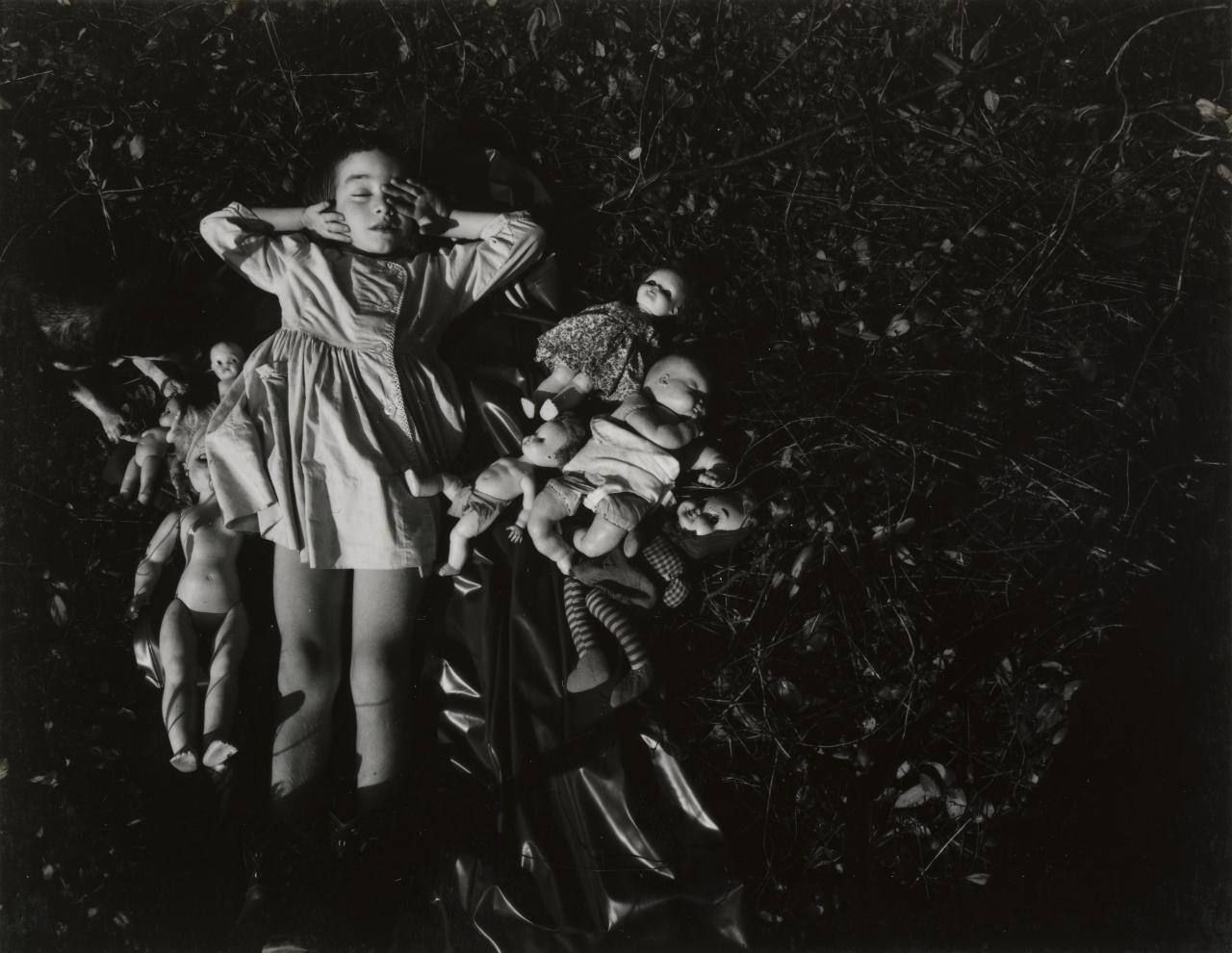 DescriptionImage of girl with eyes closed, wearing dress and laying in grass surrounded by dolls.Copyright© Emmet Gowin