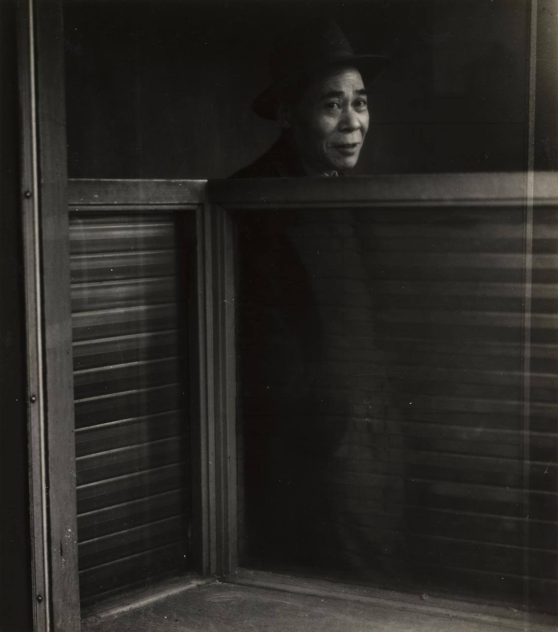 DescriptionImage of man wearing hat with body partially hidden behind blinds.Copyright© Estate of Don Seiden