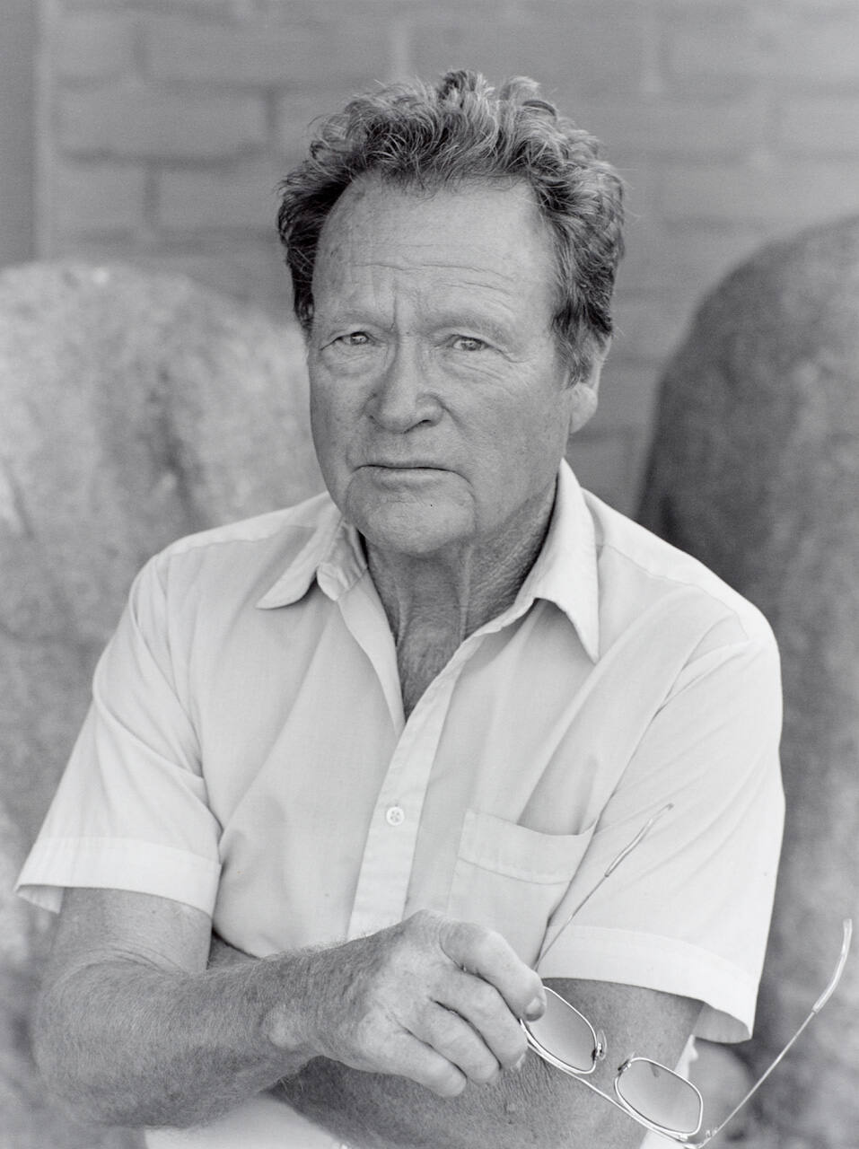 DescriptionPortrait of Brett Weston with arms crossed, holding glasses in right hand.Copyright© Abe Aronow