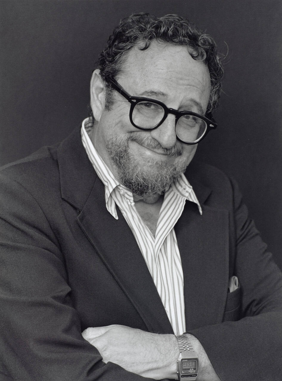 DescriptionPortrait of Arnold Newman smiling with arms crossed, wearing glasses, striped shirt, jacket, and digital watch.Copyright© Abe Aronow
