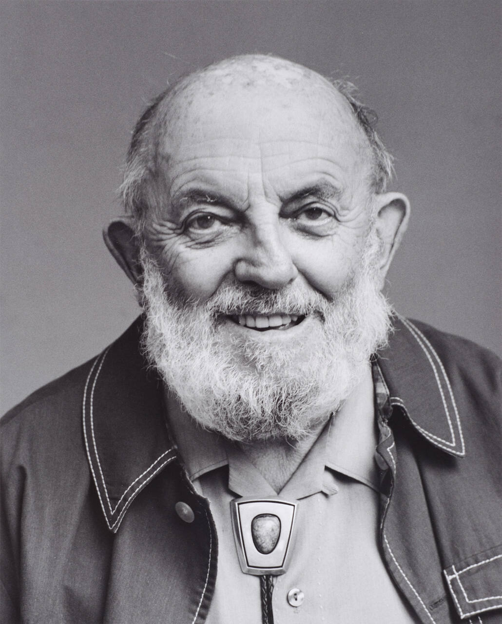 DescriptionPortrait of Ansel Adams smiling and wearing bolo tie and jacket with light colored stitching.Copyright© Abe Aronow