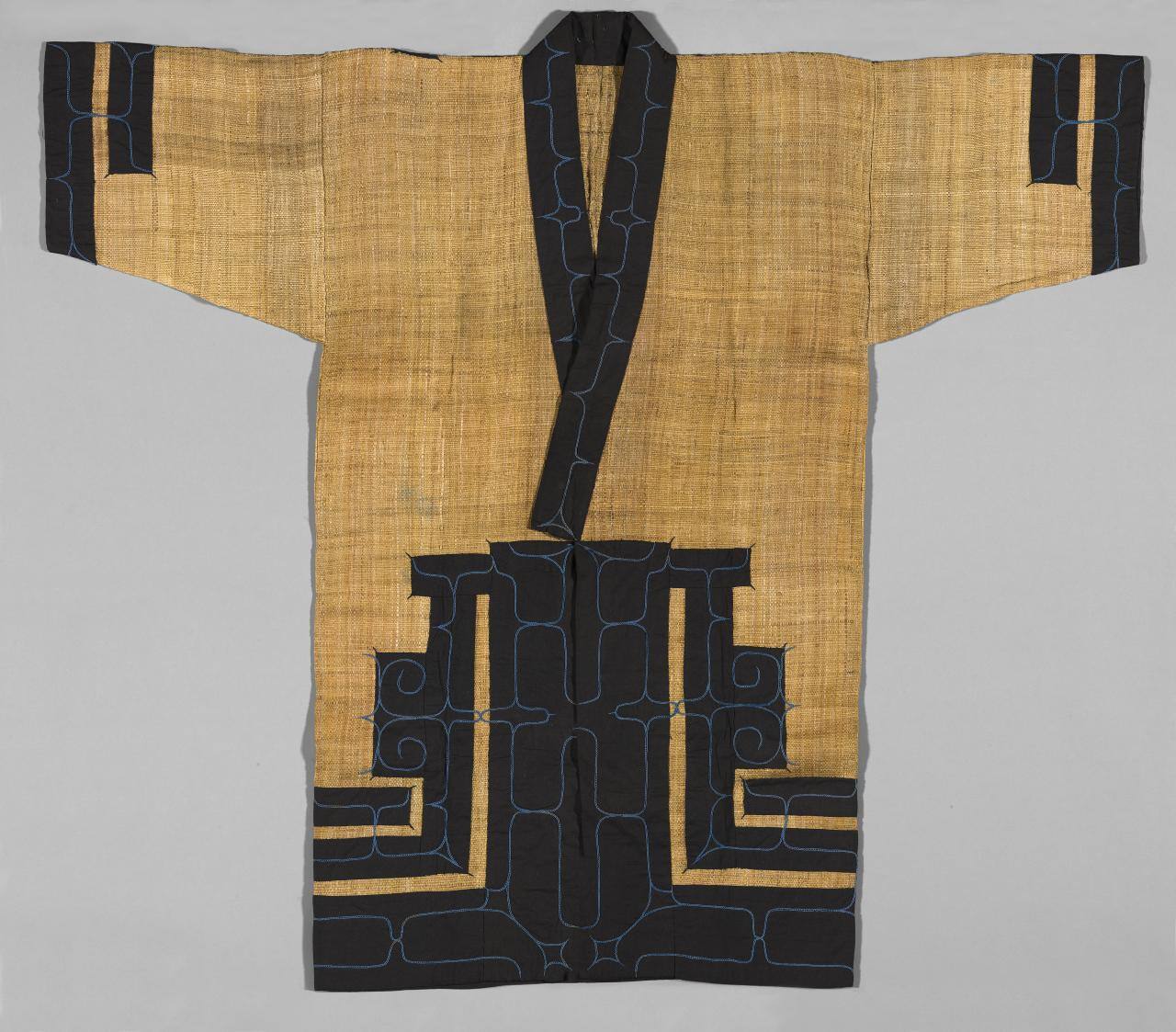 DescriptionBark fiber woven simply with single-strand warp and woof alternation into four panesl, two of which comprise one sleeve each and two of which form the body panels with a central posterior seam. The back shoulder, lapes, skirt, and cuff decorated with traditional Ainu geometric motifs in appliquéd black cotton strips, which are further embellished by cusped ovoid tracery in medium blue cotton chain stitching.Copyright© Misao Kaizawa