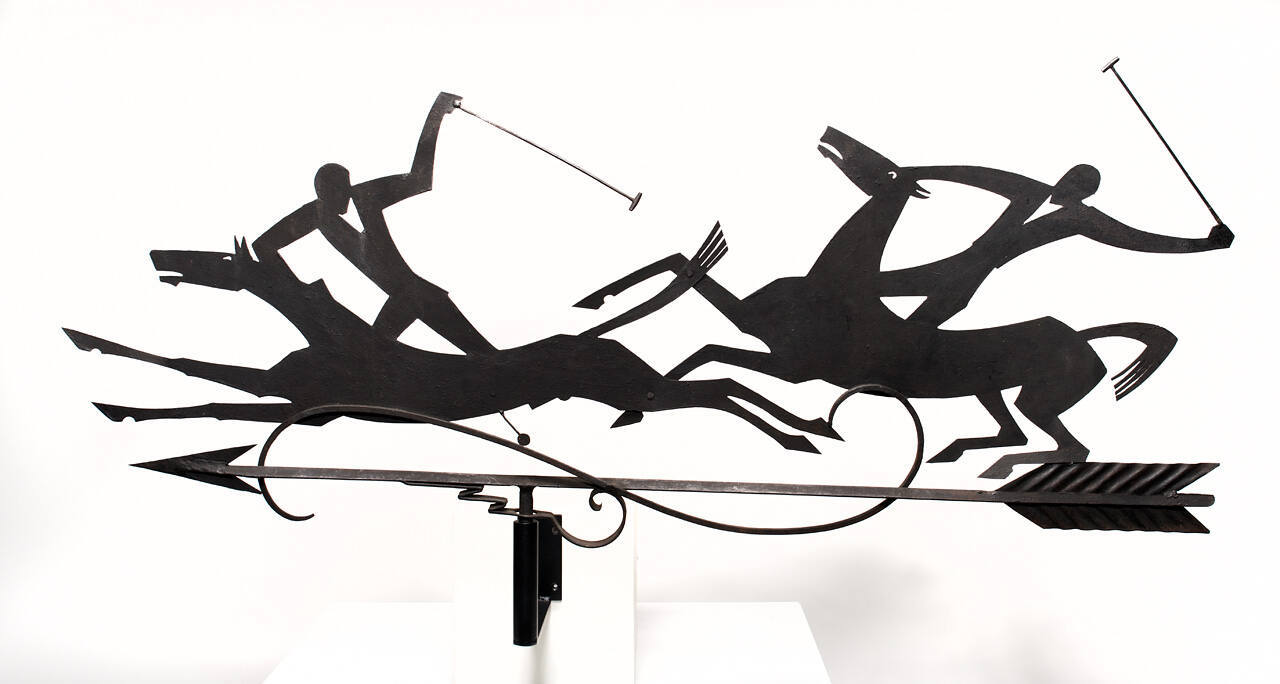 Made from sheet metal, this weathervane depicts two polo players in silhouette. The charging legs, open mouths, and wild eyes of the horses express the energy of the scene. The empty space between the figures contributes to the dynamic composition of straight and curved shapes.