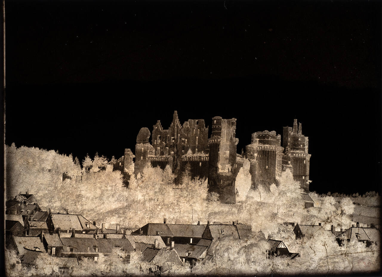 DescriptionNegative image of a deteriorating castle on a hill with trees and homes below.