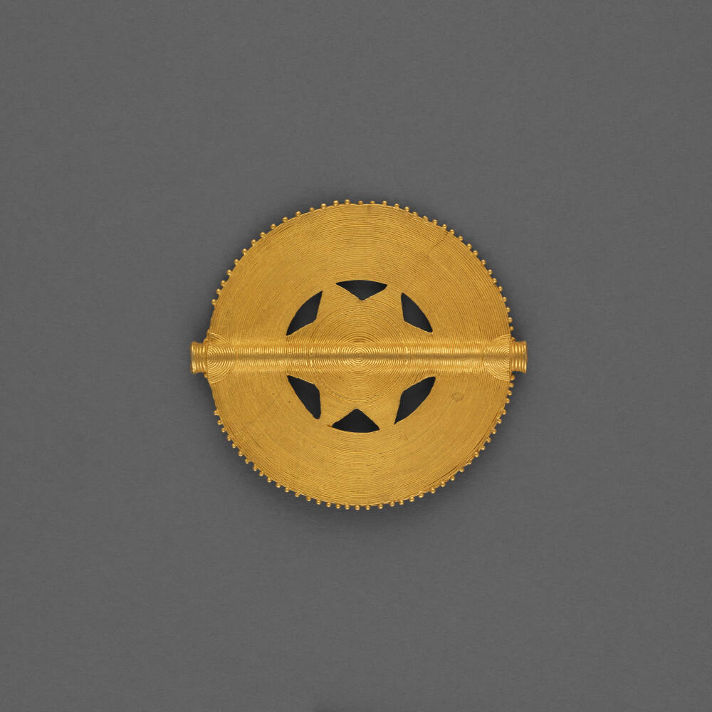 Soul washers’ badges are made of either gold leaf or cast alloyed gold and are typically inscribed on the front with motifs arranged inside concentric circles around a central cone.Exhibition History
