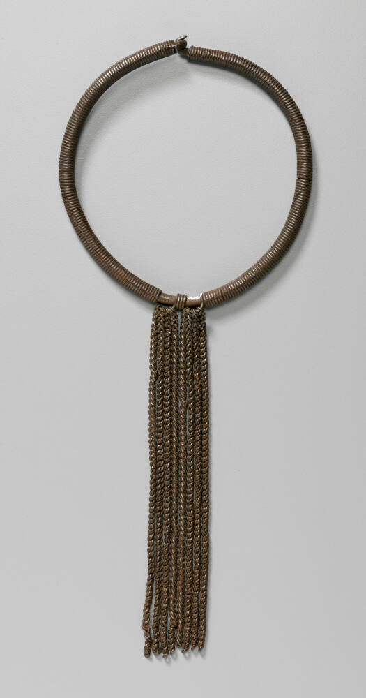 DescriptionA circular metal choker entirely decorated with wound steel wire. The front has two strands of fine industrial chain link of equal length. The simplicity yet elegant design of this neck ornament suggests links with one of East Africa’s nomadic groups, such as the Samburu or Maasai who treasure jewelry because of the ease of carrying them on their migrations.Provenance