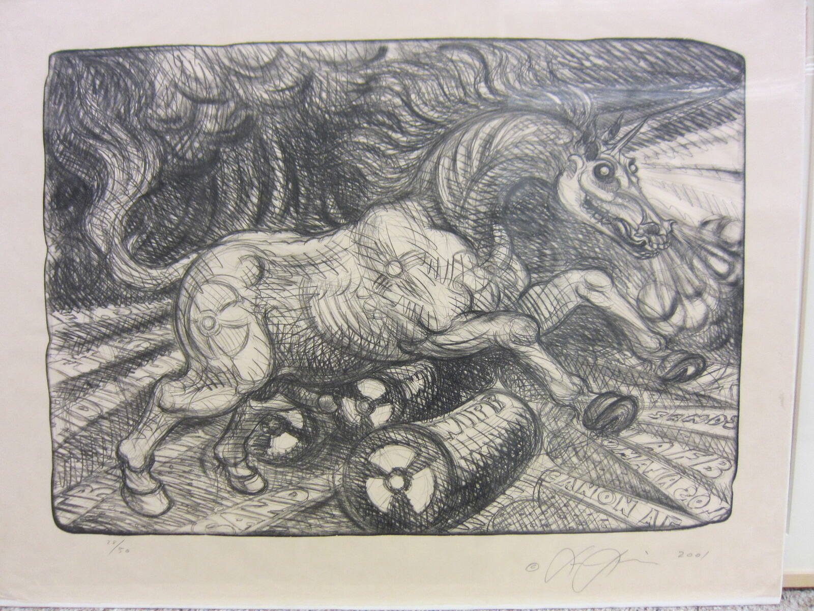 DescriptionVery active print with lines and swirls in black and white throughout. Largest image is of the horse jumping over barrel with “WIPP” visible on it (barrel). There are many words fanning out from below hooves, front and back, such as Sands and Trinity on the left and Sands and AFB on the right.Copyright© Estate of Luis A. Jimenez, Jr. / Artists Rights Society (ARS), New York