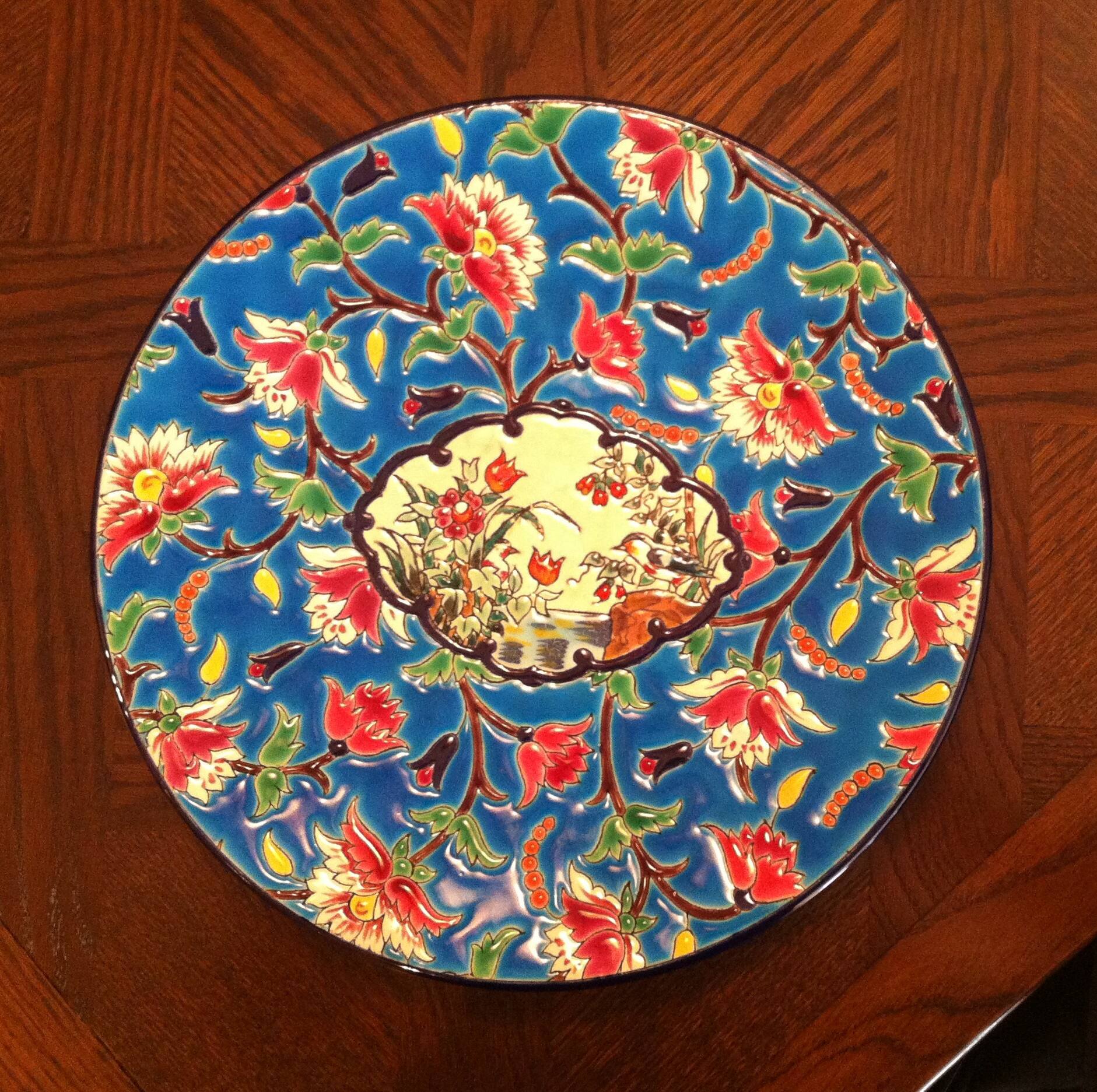 DescriptionThis cloisonné-style plate has a dense stylized foliage pattern behind an almond shaped centerpiece. The background is mainly bright turquoise-blue and depicts pomegranate flowers in different stages of bloom. The flowers are red with white tips, and yellow centers and stems of red beads. The centerpiece depicts a landscape scene, with similar blossoming flowers (in less detail and color), a body of water in the center horizon, and a bird perched on a rock.Provenance