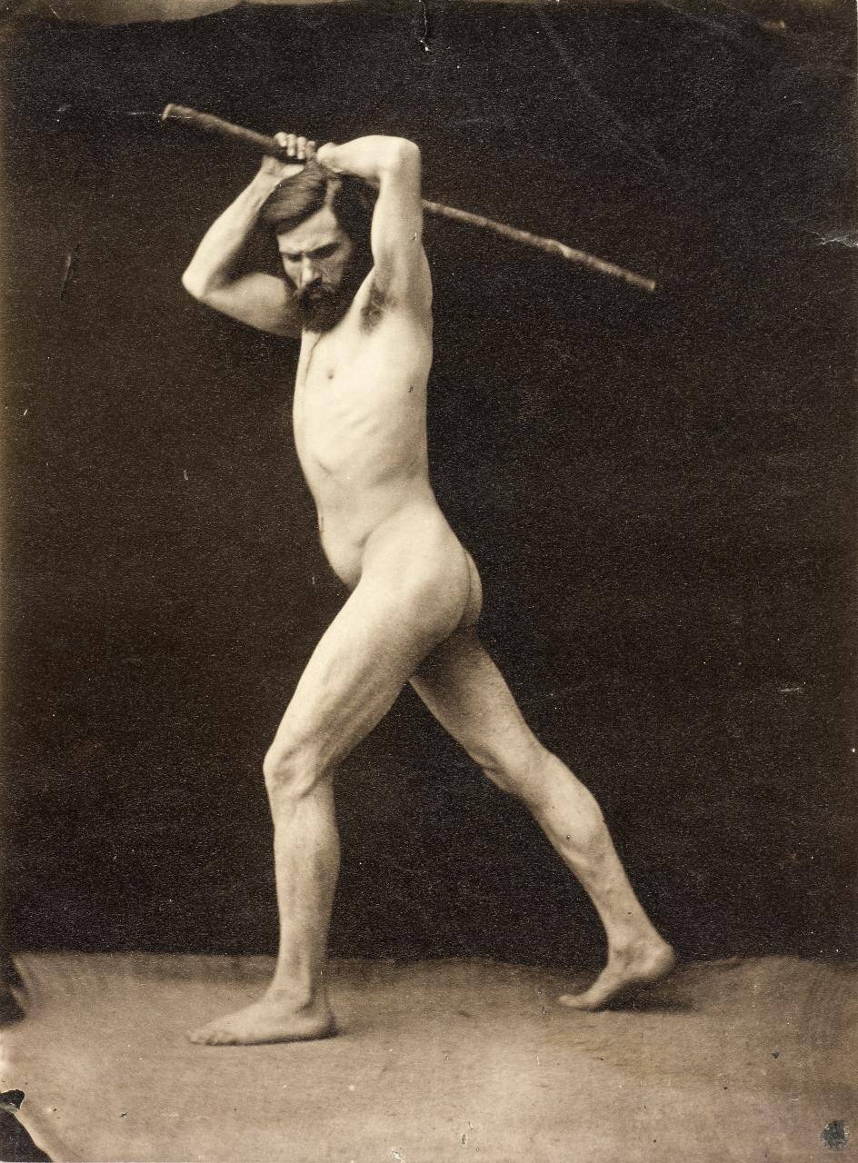 DescriptionImage of bearded male nude standing in profile while holding a stick above his head and looking down.Gallery LabelGaudenzio Marconi made a living making nude photographic studies for students at Paris’s prestigious School of Fine Arts. Photographs like this one served as affordable and highly portable alternatives to live models. Here, Marconi posed the model in a heroic, active stance similar to those found in history paintings (paintings with classical, biblical, and historical subject matter).