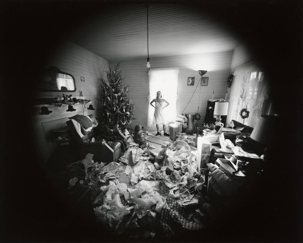 DescriptionVignetted view of woman (Edith Gowin) wearing nightgown and standing beside Christmas tree with presents and wrapping scattered all over floor.Copyright© Emmet Gowin