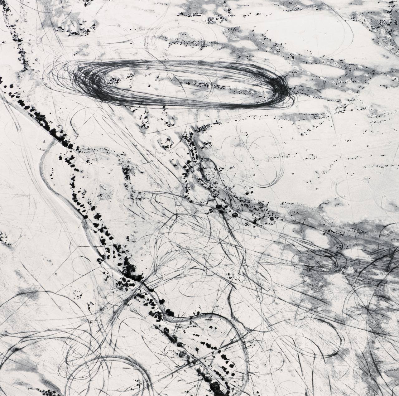DescriptionToned gelatin silver print; Aerial image with abstract circular lines and small dark spots on the land.Copyright© Emmet Gowin