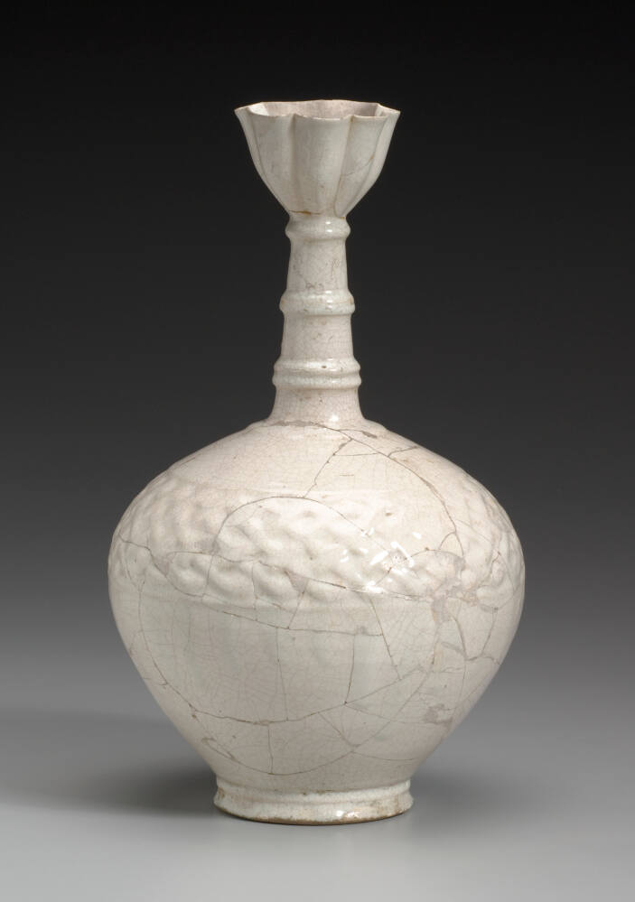 The development of fritware, an artificial ceramic material made from combining quartz, ground glaze and clay, enabled potters to create new types of vessels and decoration.  This mix of materials allowed potters to create ceramic forms that were taller, thinner, and stronger than earlier earthenware vessels. The light color of the frit body, accentuated by white glaze, was intended to replicate the appearance of Chinese porcelain. However, the molded decoration of interwoven geometric patterns was inspired by Islamic designs.