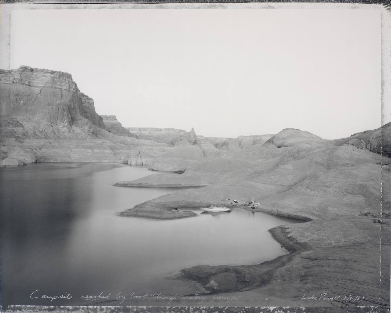 InscribedInscribed on image recto, bottom edge, in silver pen: "Campsite reached by boat through watery canyons" , "Lake Powell 8/20/83"