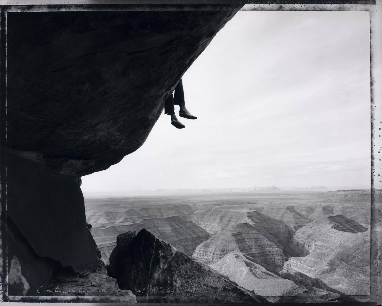 DescriptionImage of man's feet dangling off edge of cliff, overlooking mountains.Copyright© Mark Klett