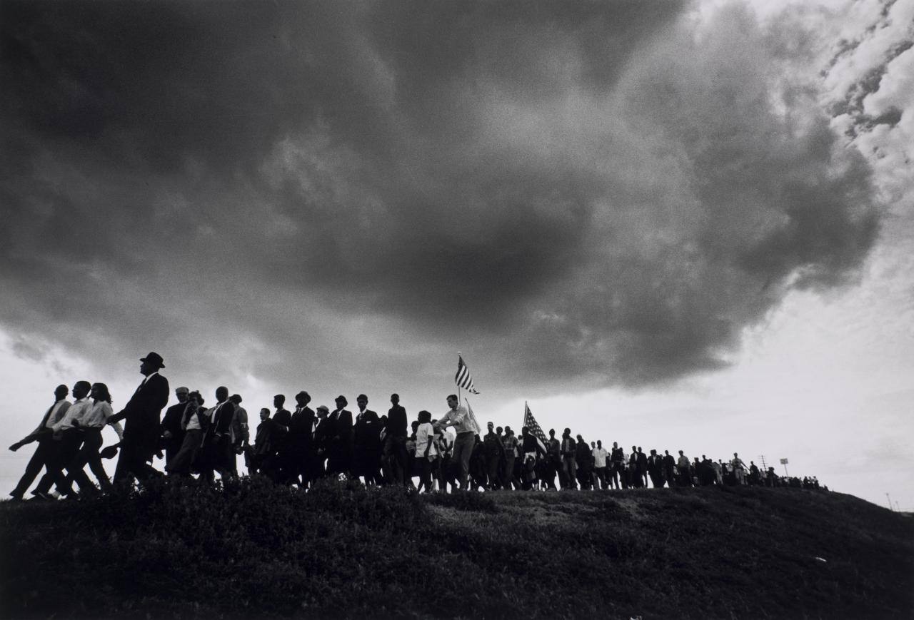 DescriptionImage of a crowd walking along a hill top and holding American flag.Copyright© Estate of James Karales