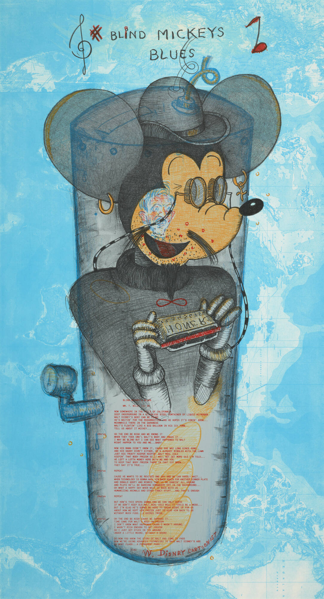 DescriptionLarge figure of Mickey Mouse holding harmonica, sandwiched inside what could be a music box, or a cheese grater, over words to song printed in background over map.Gallery LabelWilliam T. Wiley found inspiration in the urban legend that Walt Disney was cryogenically preserved after his death in hopes of future reanimation. He superimposed a portrait of the cartoonist and his most iconic character over a cryogenic tank. The “icy tomb,” which floats like a satellite above a world map, is inscribed with lyrics to Mickey’s Blues, a song Wiley wrote and liked to perform. Layered with imagery, humor, and social critique, Blind Mickey’s Blues epitomizes Wiley’s pivotal role in the Bay Area, California, “Funk” art scene of the 1960s and 1970s.