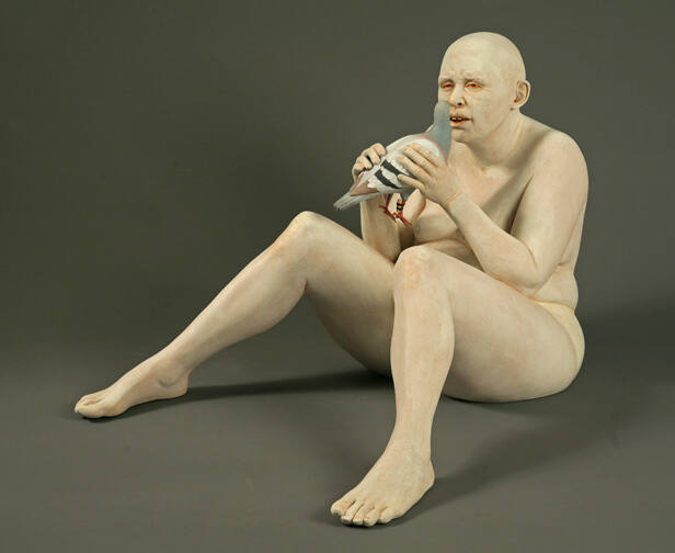 DescriptionThis is a realistic stoneware figure of a seated woman. Her legs are bent at the knees with her feet flat on the floor. Her bent elbows nearly rest on her thighs and she holds a carrier pigeon in her hands. The surface of the figure is finished with paint, pastels and mixed media and is unglazed. The woman has a sickly pale white complexion with undertones of orange. The subject is bald, with bloodshot eyes, a slightly opened mouth and is nearly nude except for underwear briefs. The eyes have a clear glaze or coating over them to saturate the color and to depict tears. The polychrome pigeon is decorated in various shades of violet, black, white and brown pigments, with a small note attached to the proper right foot.Copyright© Tip Toland