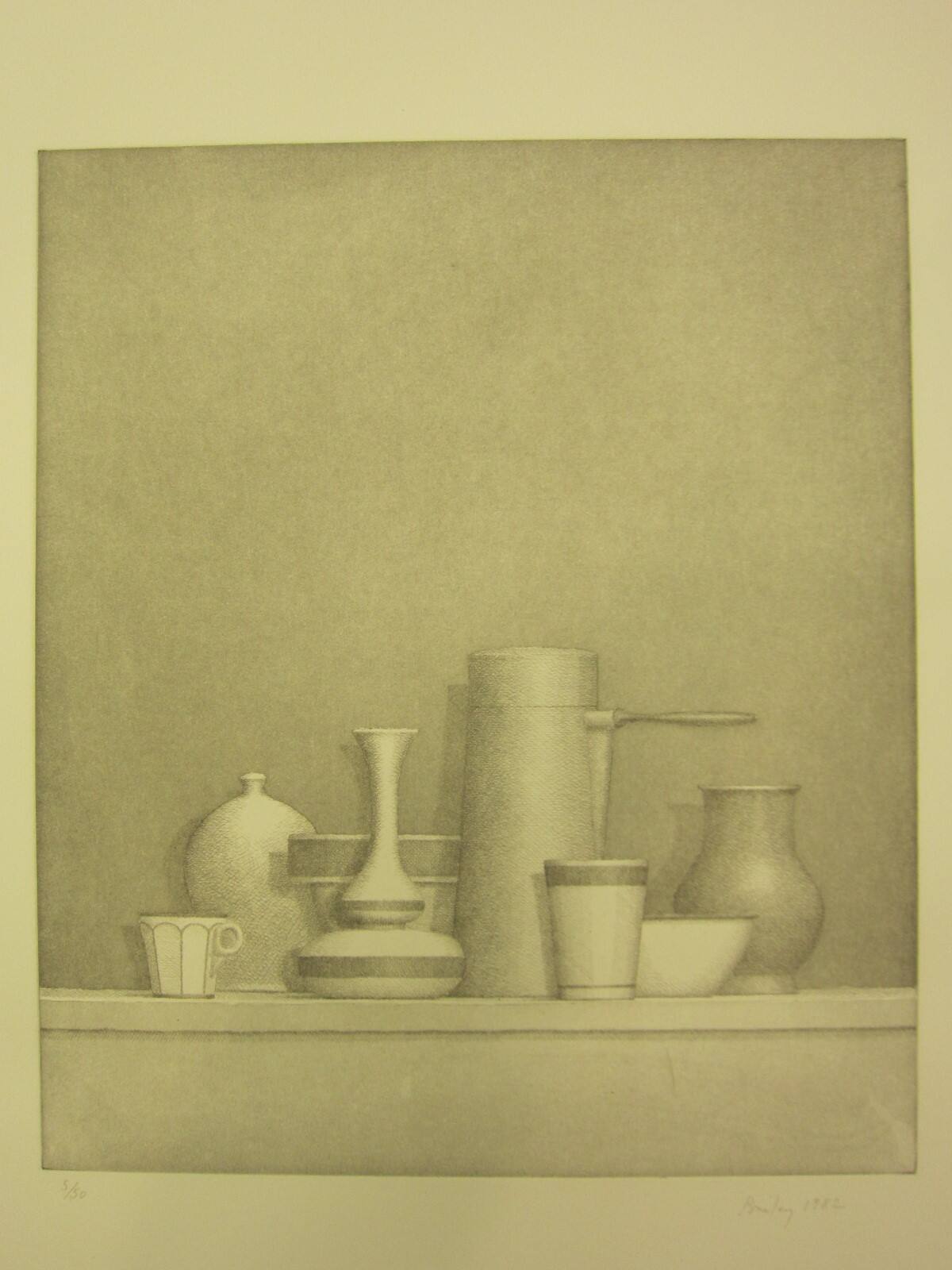 DescriptionEight items make up this overall grey toned still life, from a small cup at left with objects of varying heights, sitting on a ledge (shelf). The artist refers to his cups, bowls and vases as “actors in a reperatory company”. In the center is the tallest object, a tall pot with a handle.Copyright© William Bailey / Signet Arts, St. Louis, MO