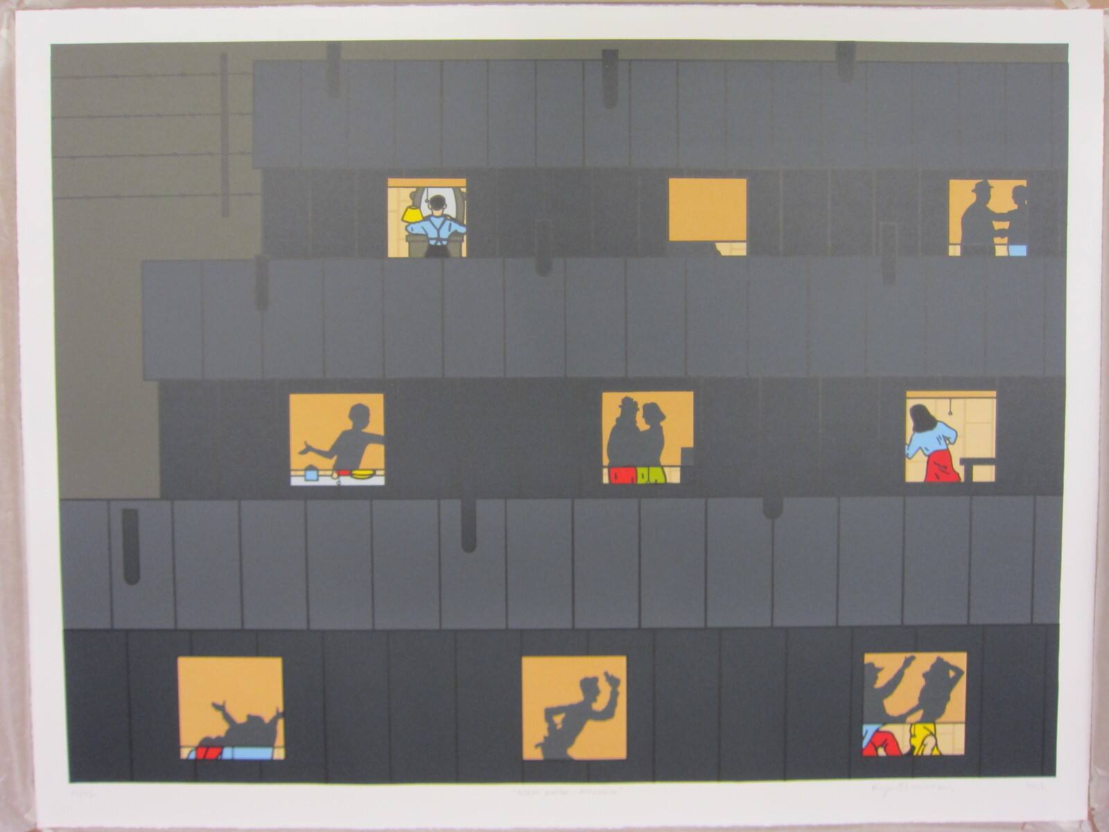 DescriptionDarkened building with nine lighted windows, (three on each of three floors). “The grey and brown colors of Camp Minidoka by day turn into a lovely theater of lights at night as the incarcerees complete another day of isolation from the rest of the country.” Roger Shimomura.. People leading different activities within each of the lighted windows .Copyright© Roger Shimomura