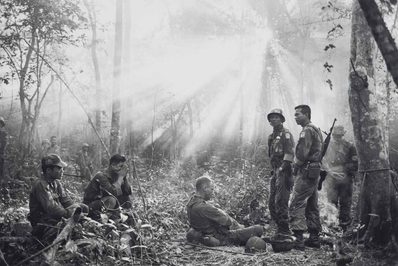 DescriptionImage of soldiers in wooded area with sunlight streaming through trees.Copyright© Horst Faas Estate