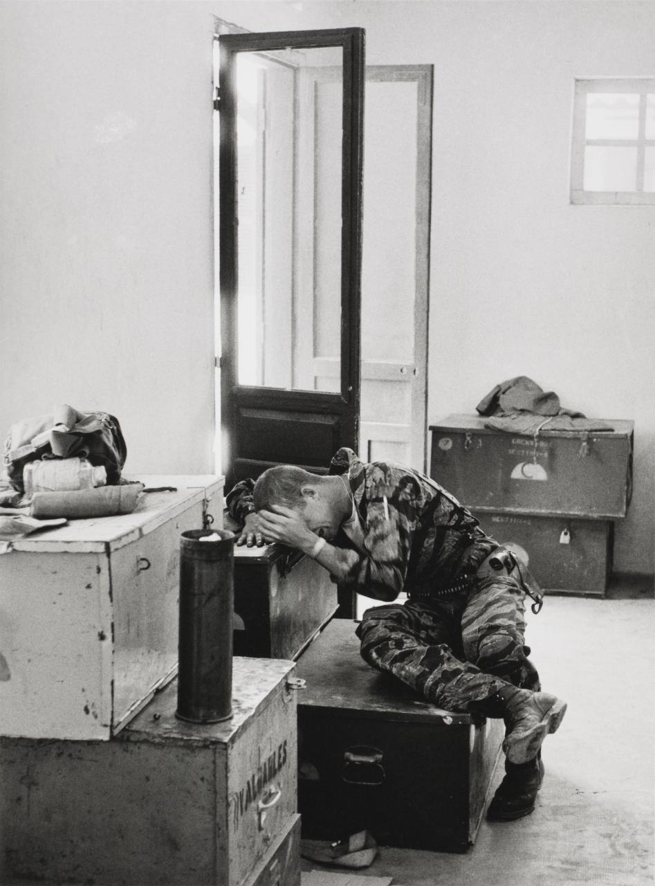 DescriptionImage of soldier wearing fatigues and covering face while crying.ProvenanceHall Family Foundation, 2014;