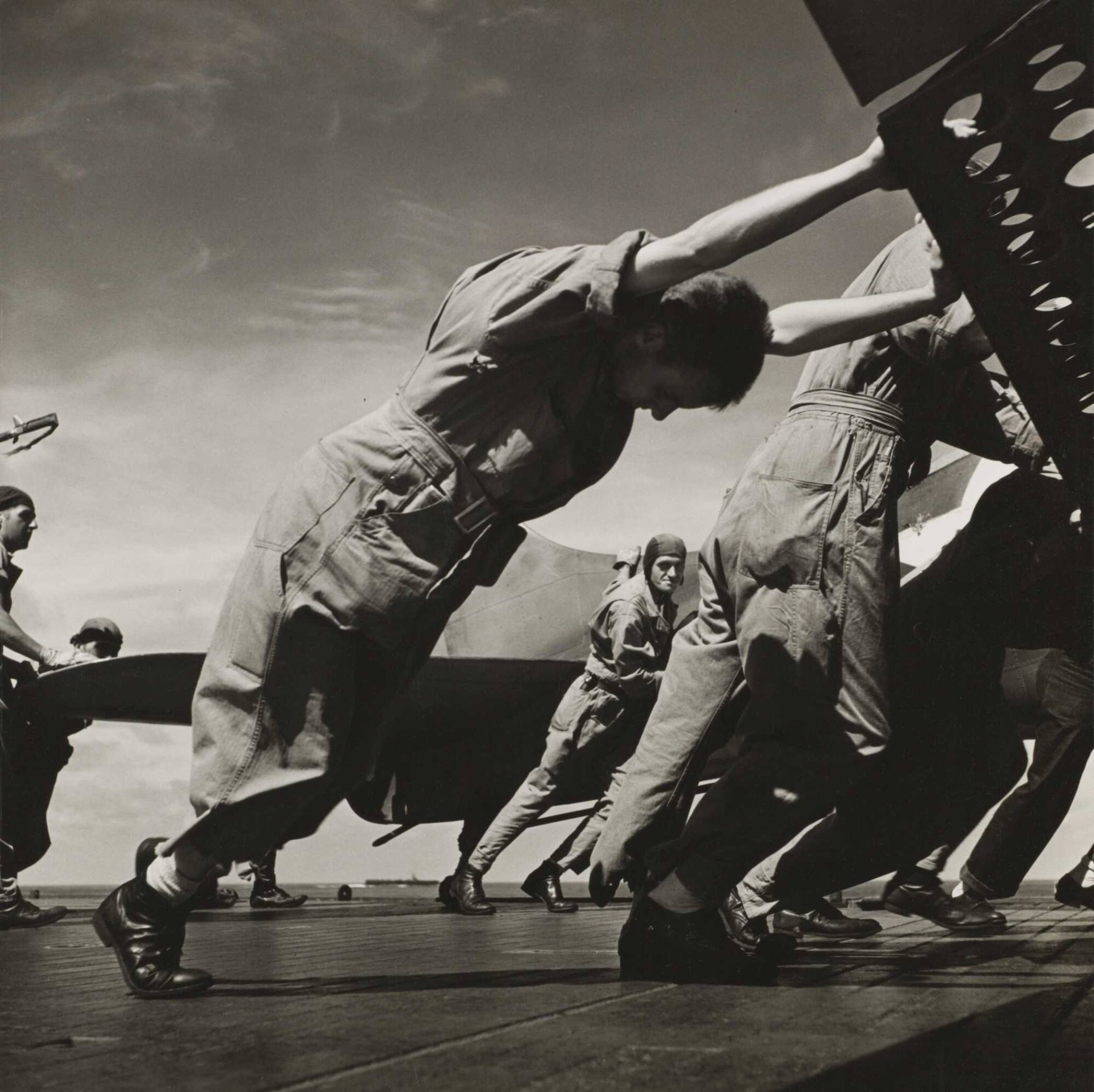Wayne Miller took this photograph at a low angle and in close proximity to men straining to push an airplane on the deck of an aircraft carrier. His composition emphasizes the physical and emotional experience of his fellow naval officers engaged in the Pacific during World War II. Miller was assigned to the Naval Aviation Unit under photographer Edward Steichen. He recorded the daily events of the war through the eyes of the men who served, at times risking his own life to get a photograph.