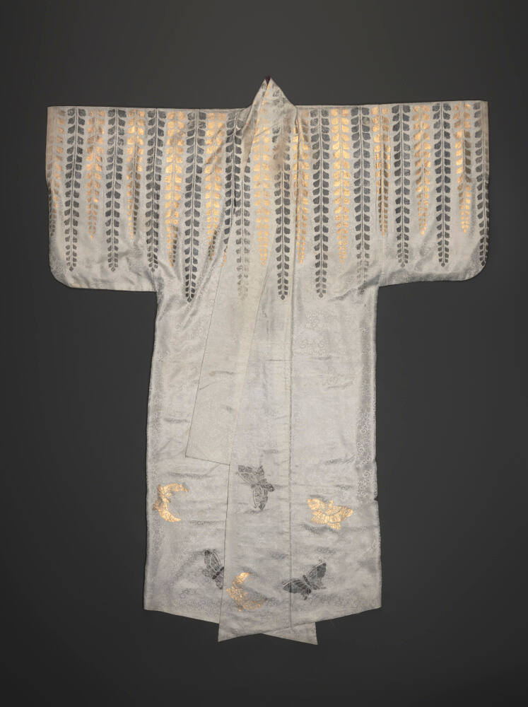 DescriptionWhite-figured satin ground with gold and silver stencil designs. No robe (Surihaku type) with designs of butterflies and wisteria.Gallery LabelImagine an actor wearing this robe during a dramatic Nō theater performance. As he sweeps across the torch-lit stage, the robe’s metallic adornments shimmer in the flickering light. This exquisite robe was meant to be worn as an inner costume by a male actor playing a female role, who might have revealed part of this robe during a performance.