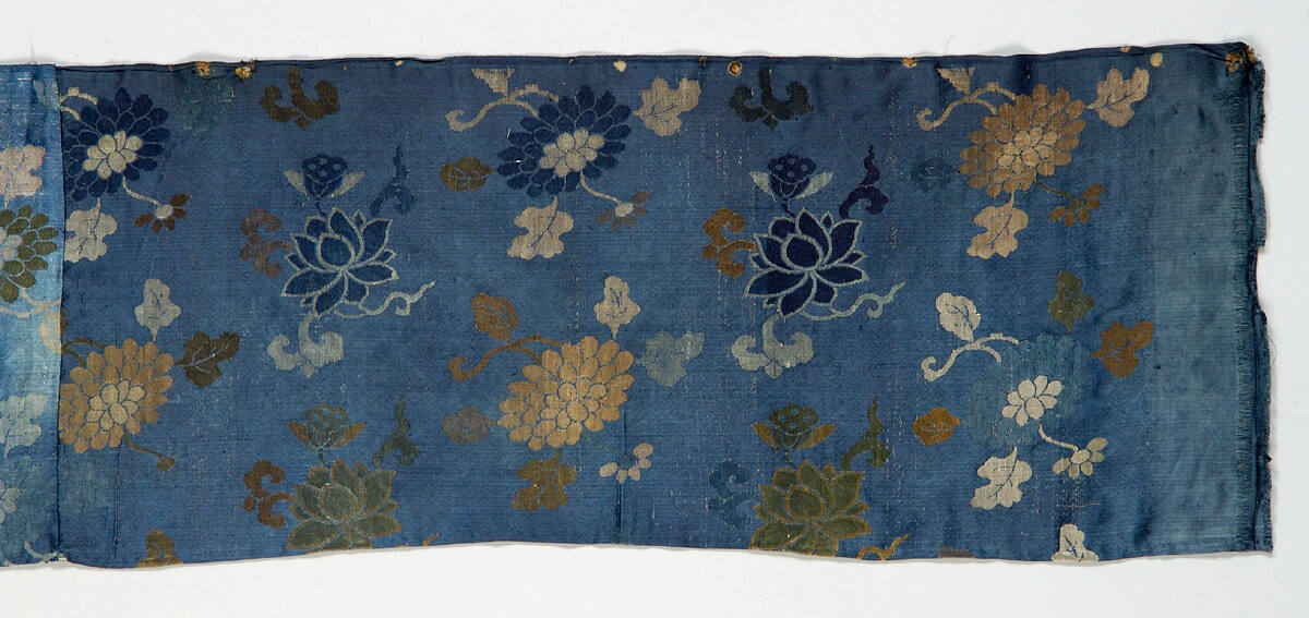 DescriptionBlue, yellow and white lotus and chrysanthemums on blue ground.