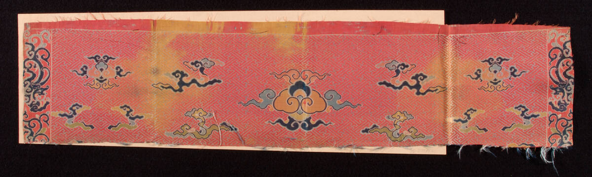 DescriptionRed silk brocaded with all-over pattern in light blue. Large designs of clouds in shades of blue, green, tan and pink.
