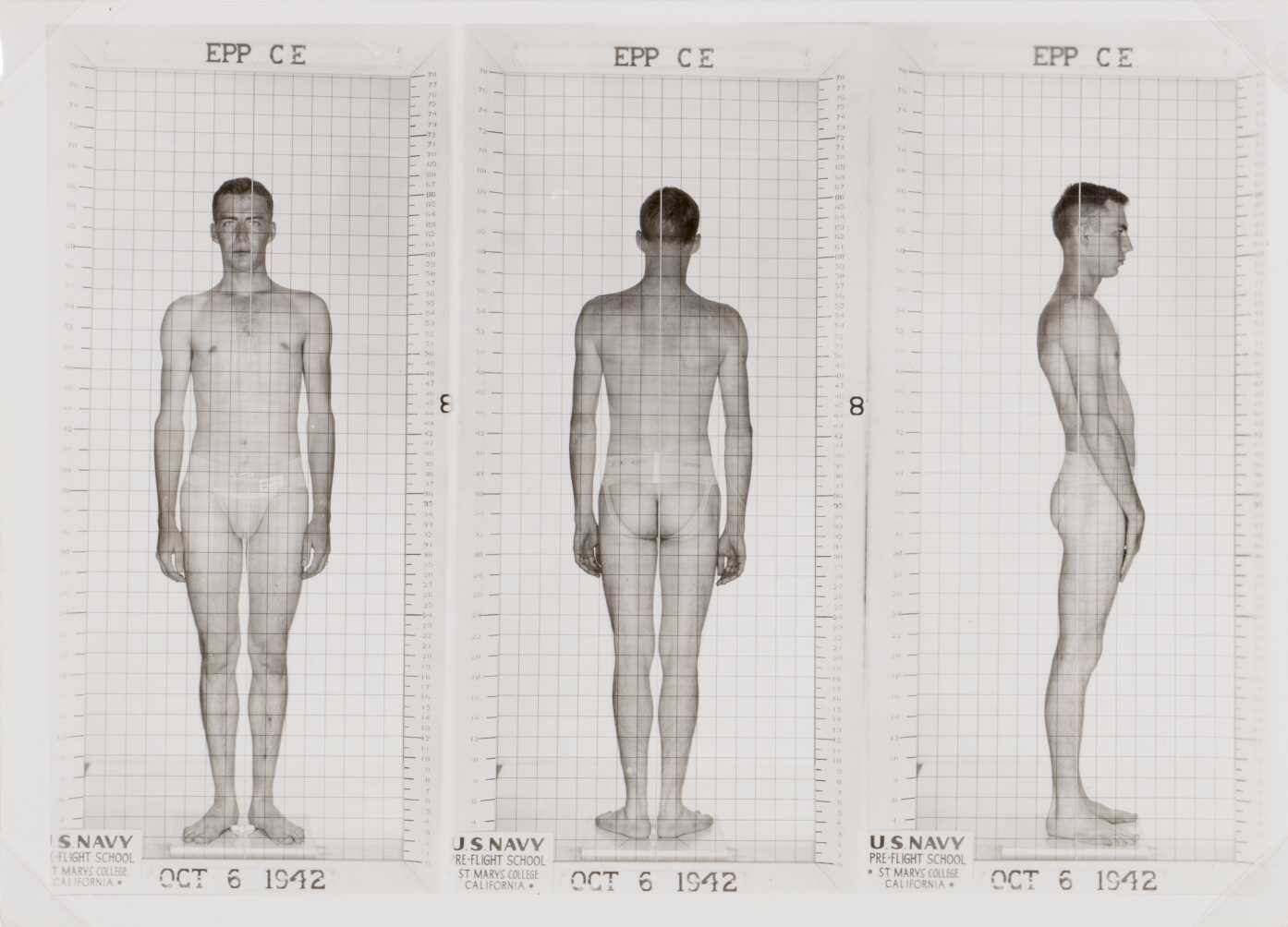 DescriptionThree images (front, back, and profile) of man (CE Epp) standing with grid overlay and date OCT 6 1942 printed below figures.