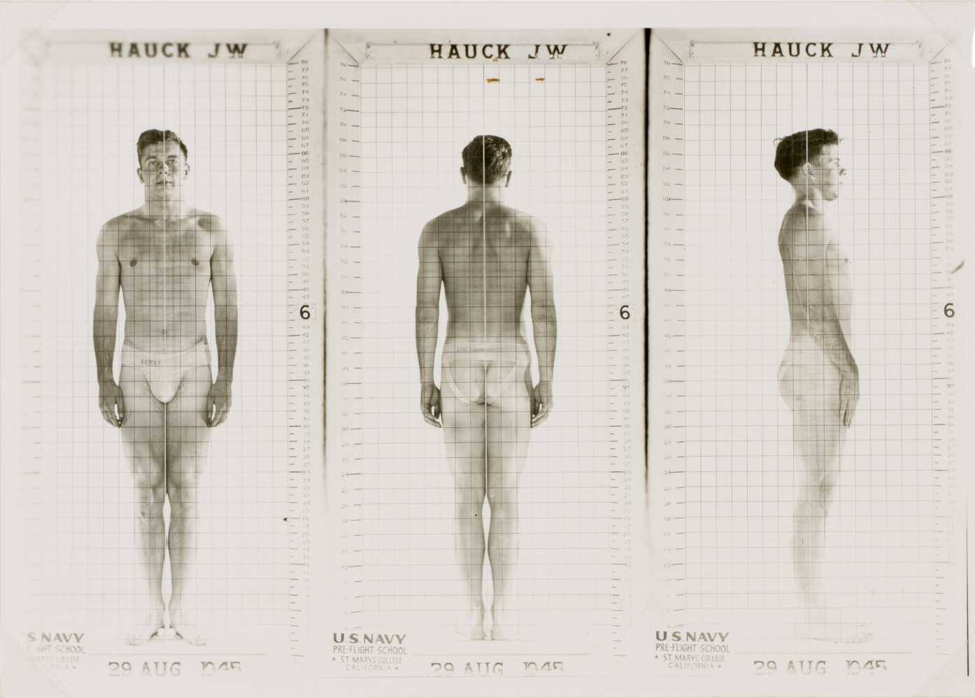 DescriptionThree images (front, back, and profile) of man (JW Hauck) standing with grid overlay and date 29 AUG 1945 printed below figures.