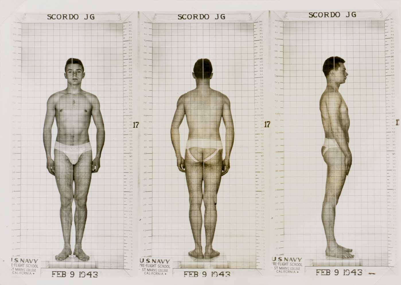 DescriptionThree images (front, back, and profile) of man (JG Scordo) standing with grid overlay and date FEB 9 1943 printed below figures.