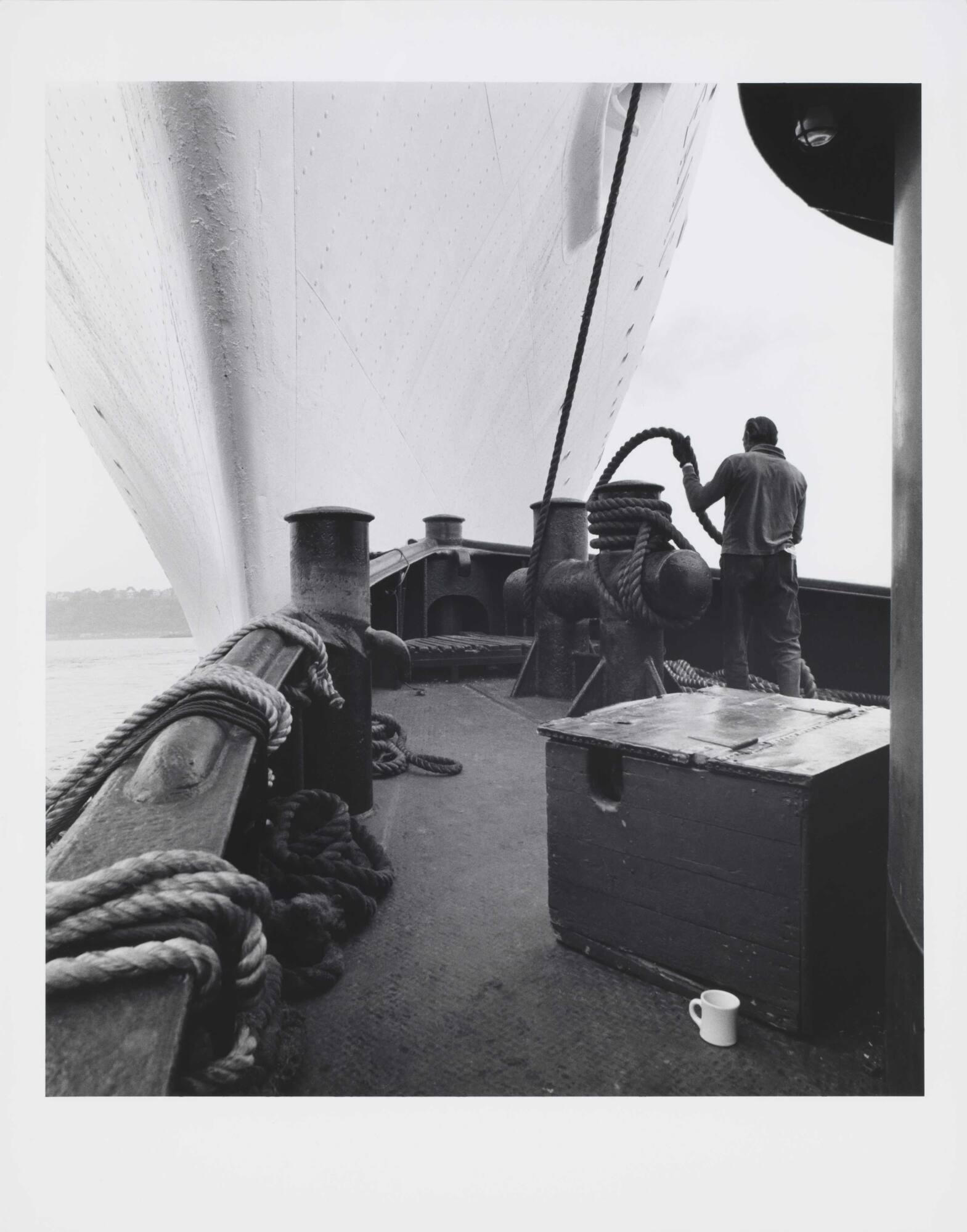 DescriptionImage of a man holding rope on ship deck with coffee mug in foreground.