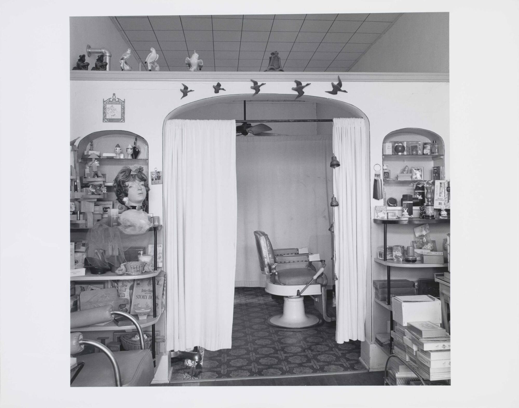 DescriptionImage of a beauty salon with chair revealed behind curtain and flying birds mounted to wall above doorway.Copyright© David Plowden