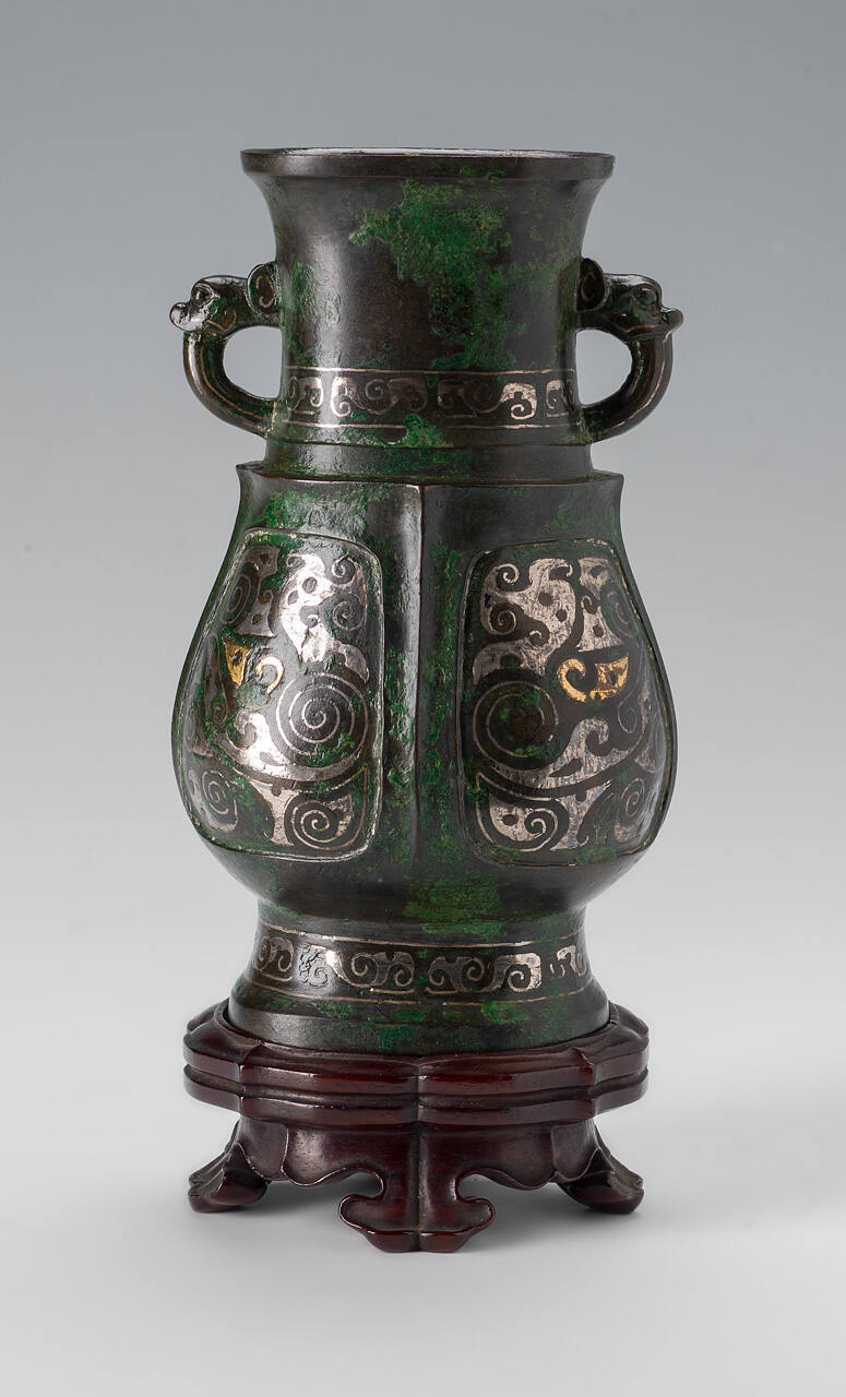 DescriptionMiniature vase with a conventional bird motif inlaid with gold and silver in the Han manner; two animal head handles.
