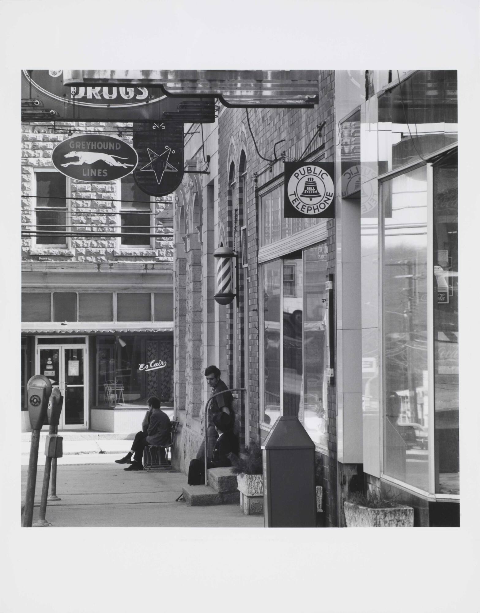 DescriptionImage of several people on the sidewalk outside shops, parking meters in front.Copyright© David Plowden