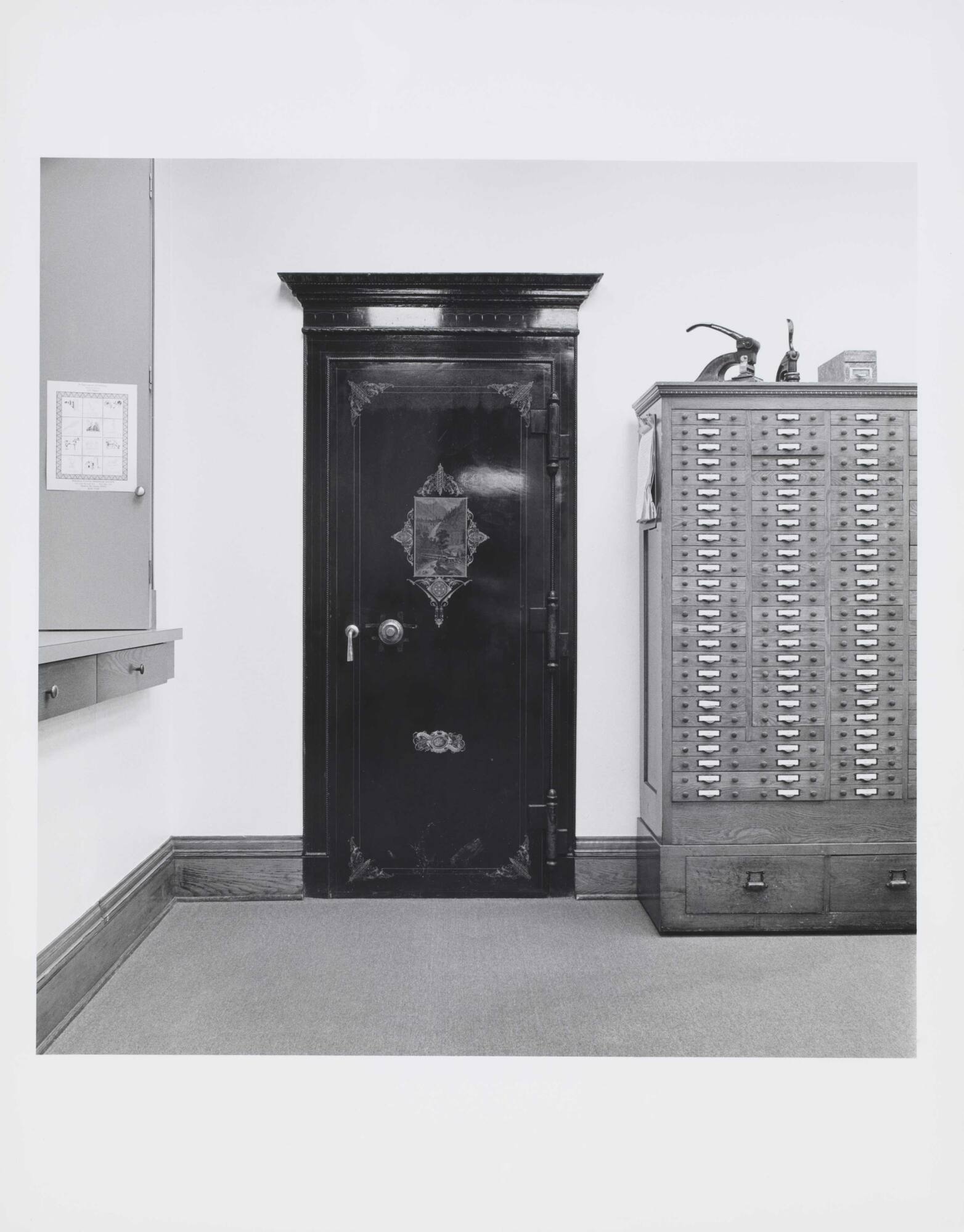 DescriptionImage of a safe door next to a cabinet with many small drawers.