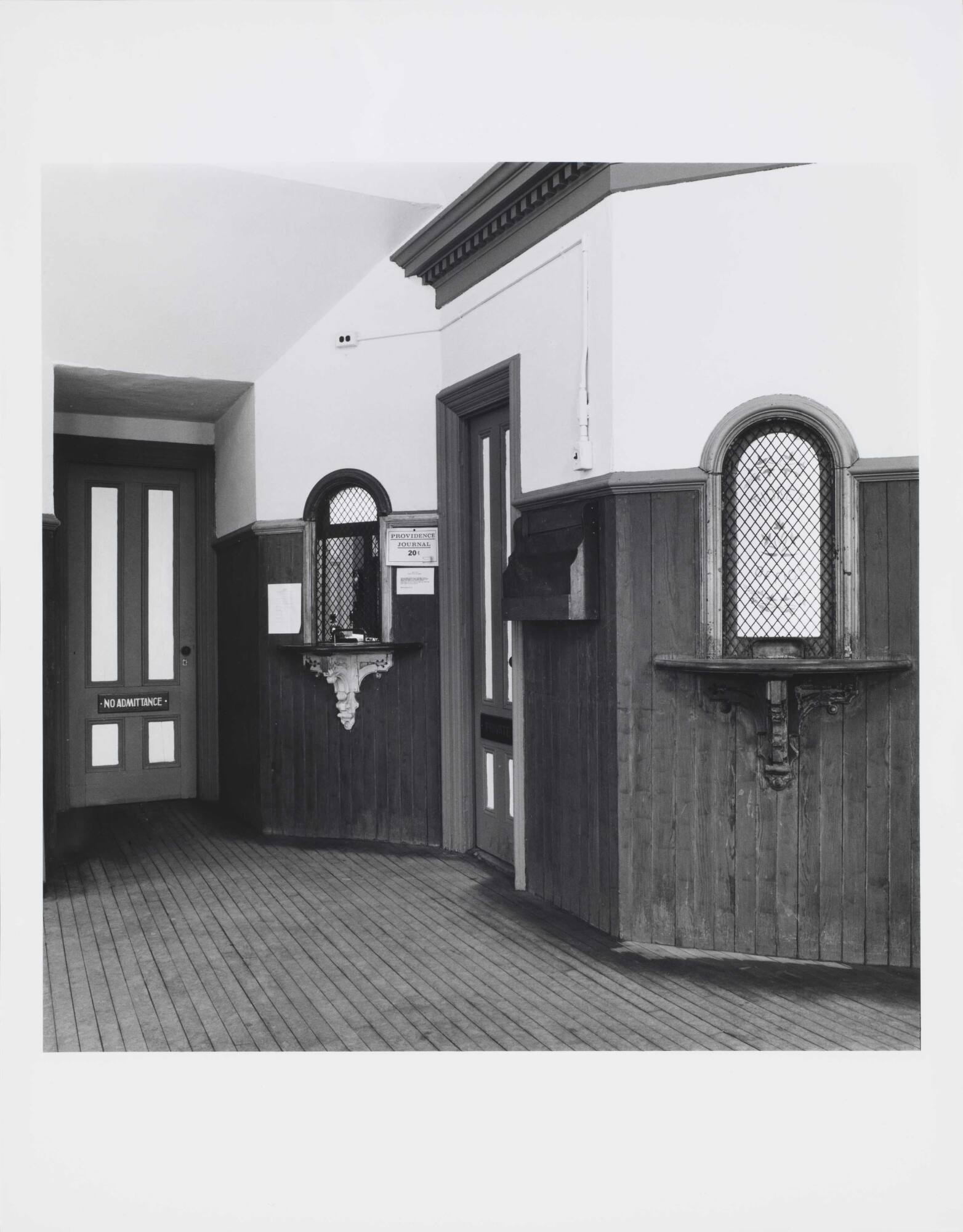 DescriptionInterior image of two ticket windows and a door reading "NO ADMINTANCE".Copyright© David Plowden
